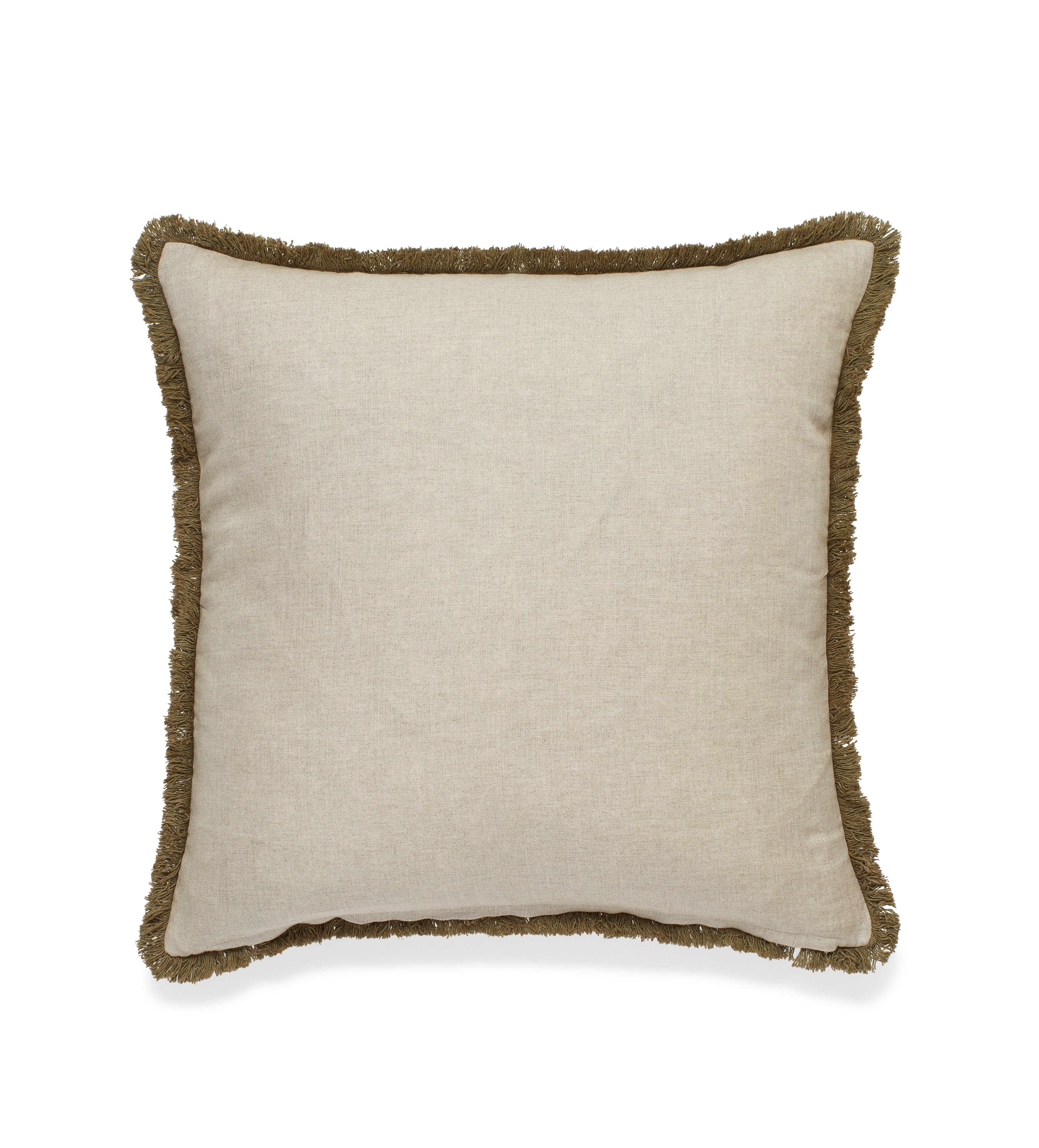 Our Arber Cushion Cover features a pretty repeating embroidery pattern of a leafy branch. The green yarn is secured on the linen base with careful white stitches and matched with a muted green fringe that surrounds the cushion.