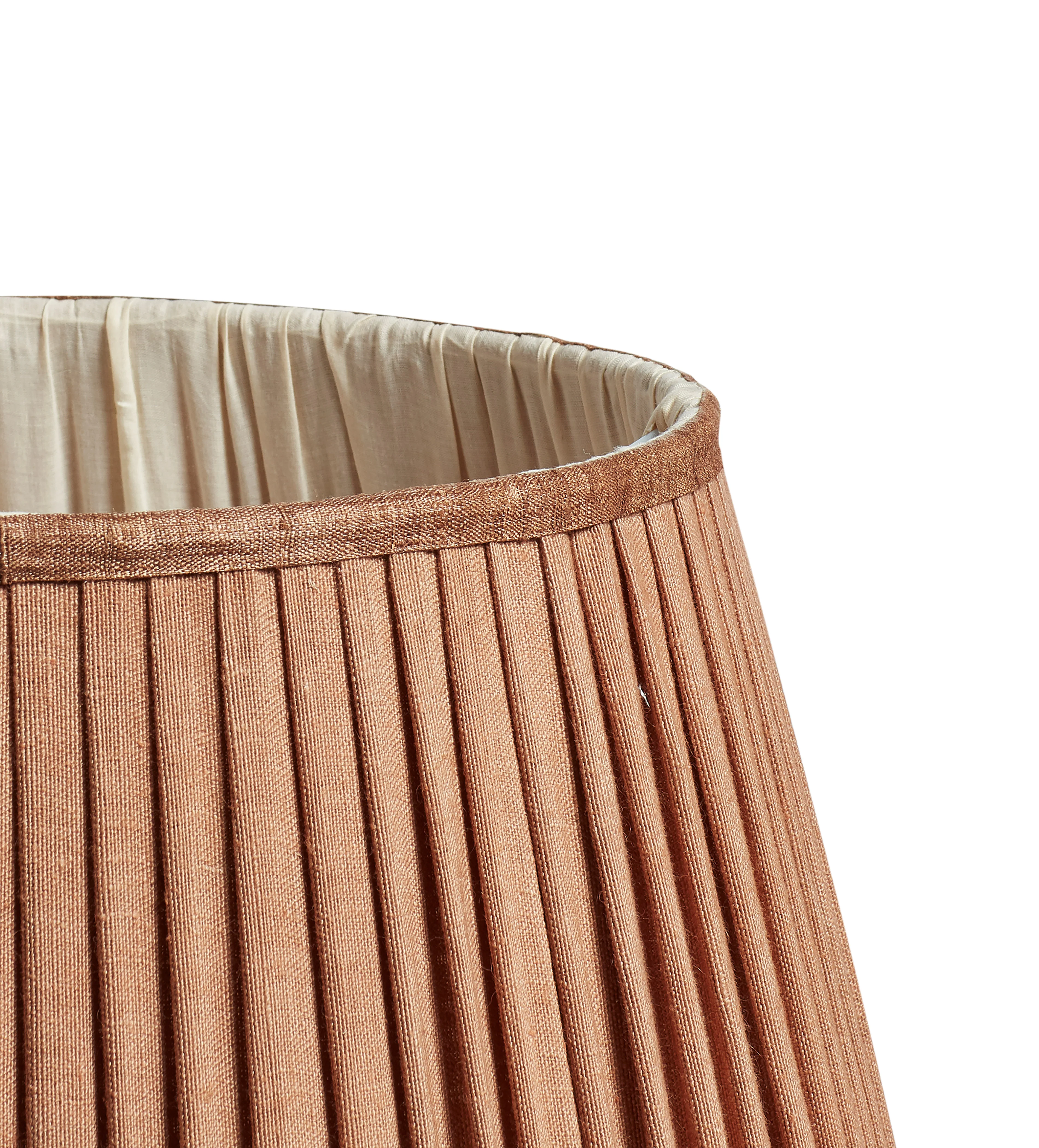 Designed to match our Archibald Cushion Covers, these linen lampshades are gathered by hand around an iron frame. They are finished with silk piping on the top and bottom. This is the larger version in a muted Apricot colour.