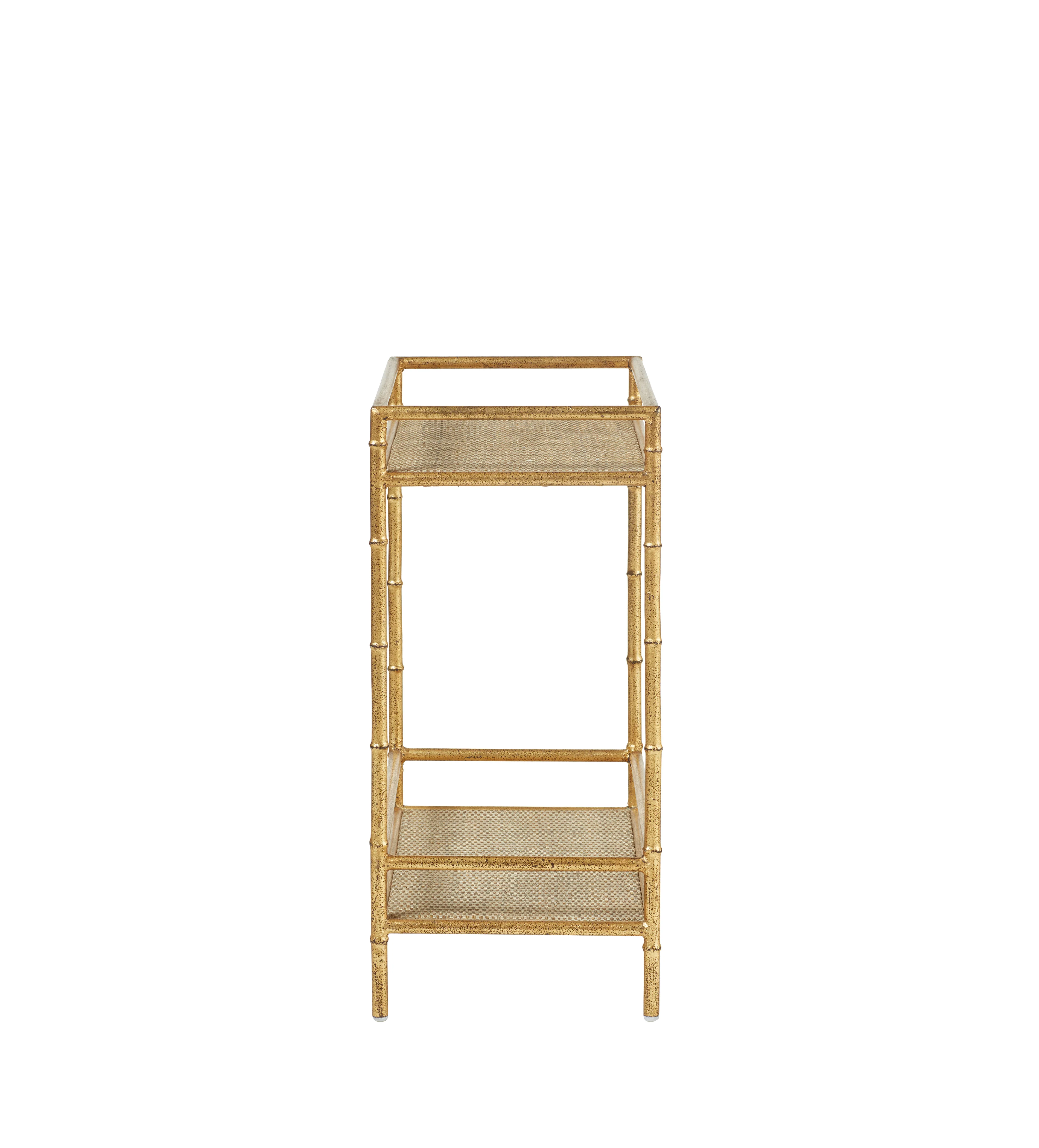 This geometric design features a bamboo-inspired iron frame - with a distressed hand-painted antique gold finish - that borders two table tops, hand-woven from metal, finished with grey paint and varnish to resemble real rattan. The beauty of this piece is that it's perfect for storing taller items, such as vases or a stack of books or records.