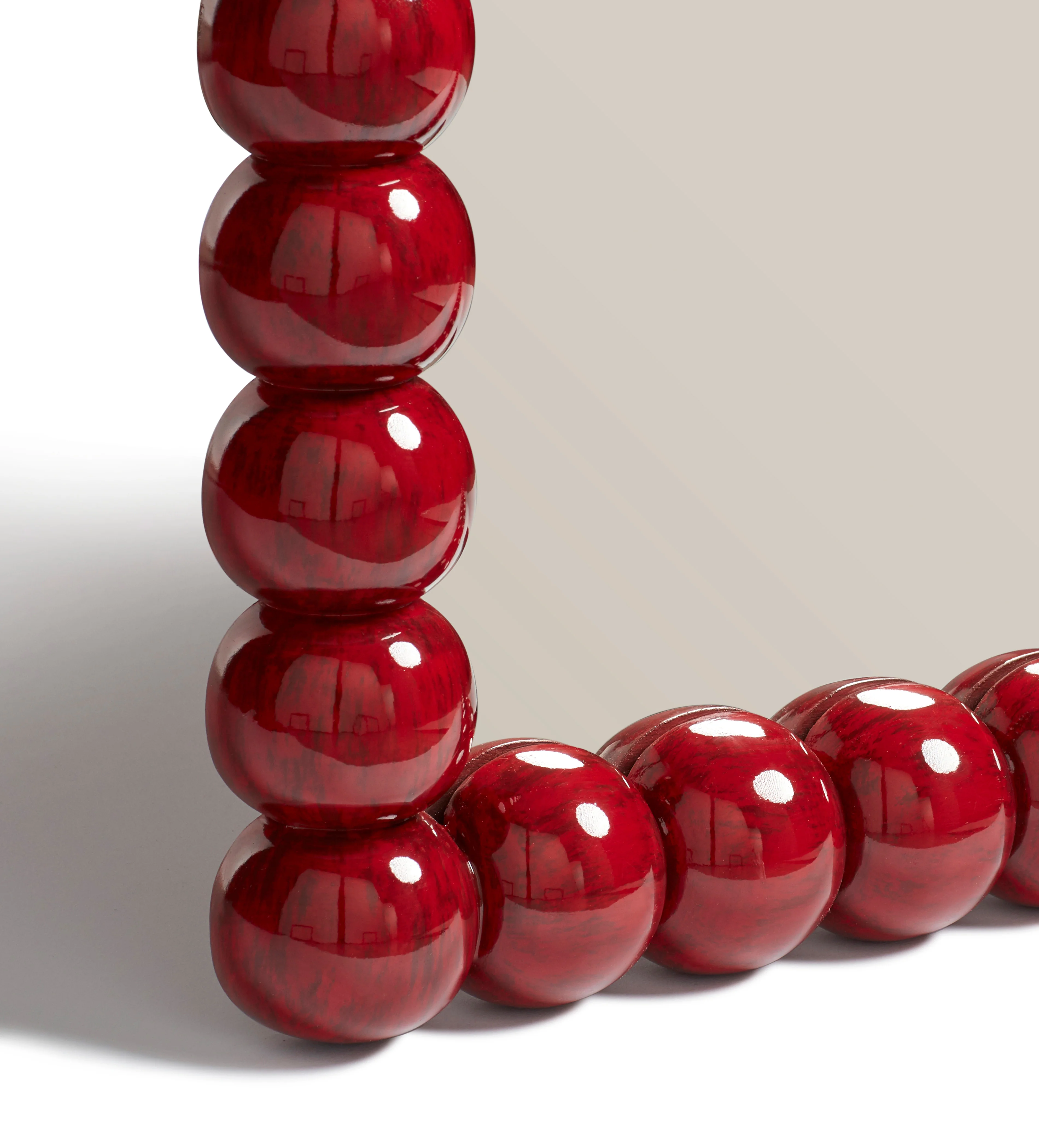 Our Bobina Mirrors are inspired by bobbin furniture - otherwise known as spool furniture - of the late 17th century. This style had legs that were generally lathe-turned into ornamental shapes in order to make a feature of them. Drawing on this characteristic, the frame of our Bobina Bobble Mirror is hand carved from mango wood into pleasing spherical shapes, which is then painted vibrant red and finished with a high gloss which accentuates its form.