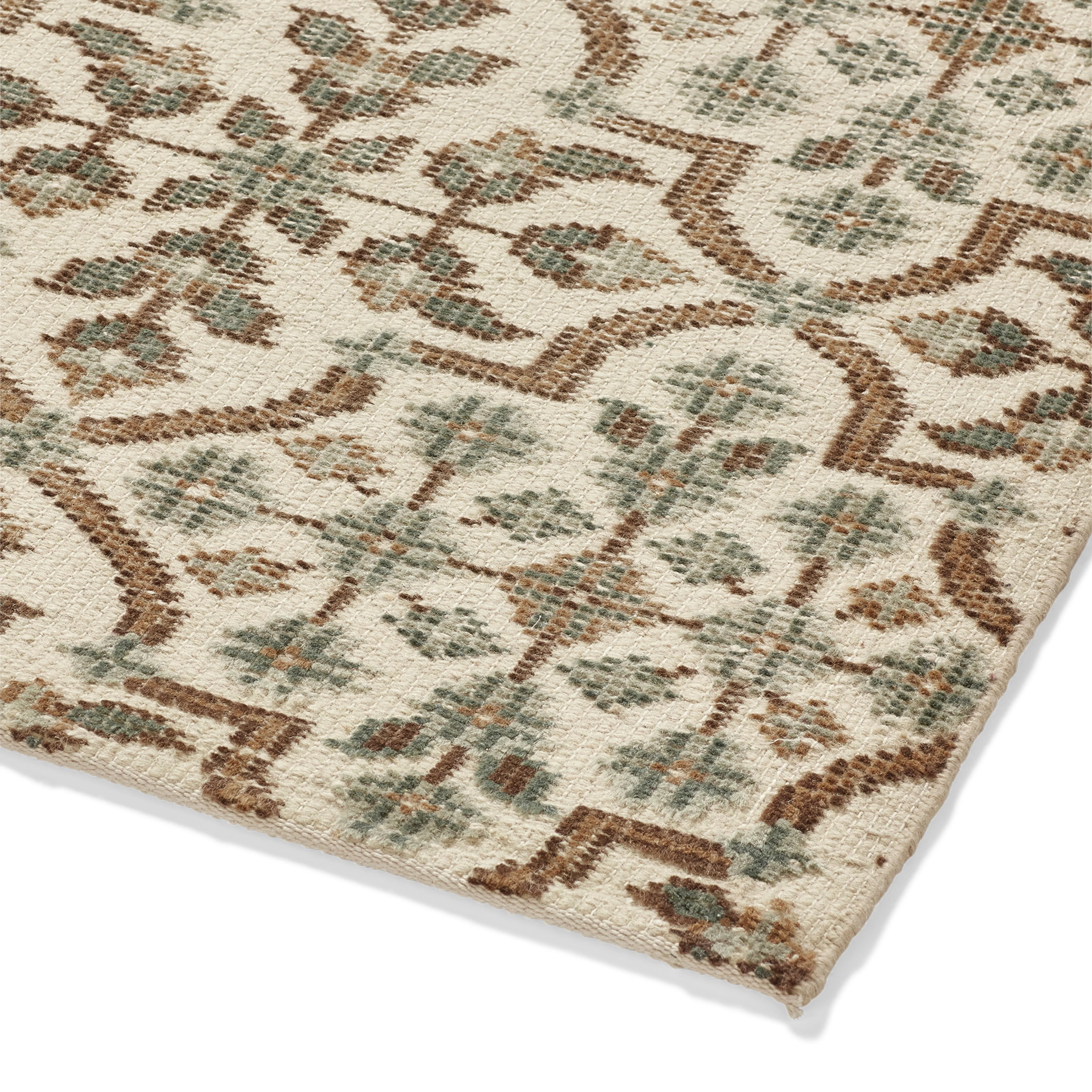 The Briony Rug features a regular botanical-inspired pattern in Natural hues with hints of Teal. The jute is first dyed, before being hand knotted and washed for an antique finish. Due to the artisanal crafting process, each piece will have individual characteristics that add to their charm.