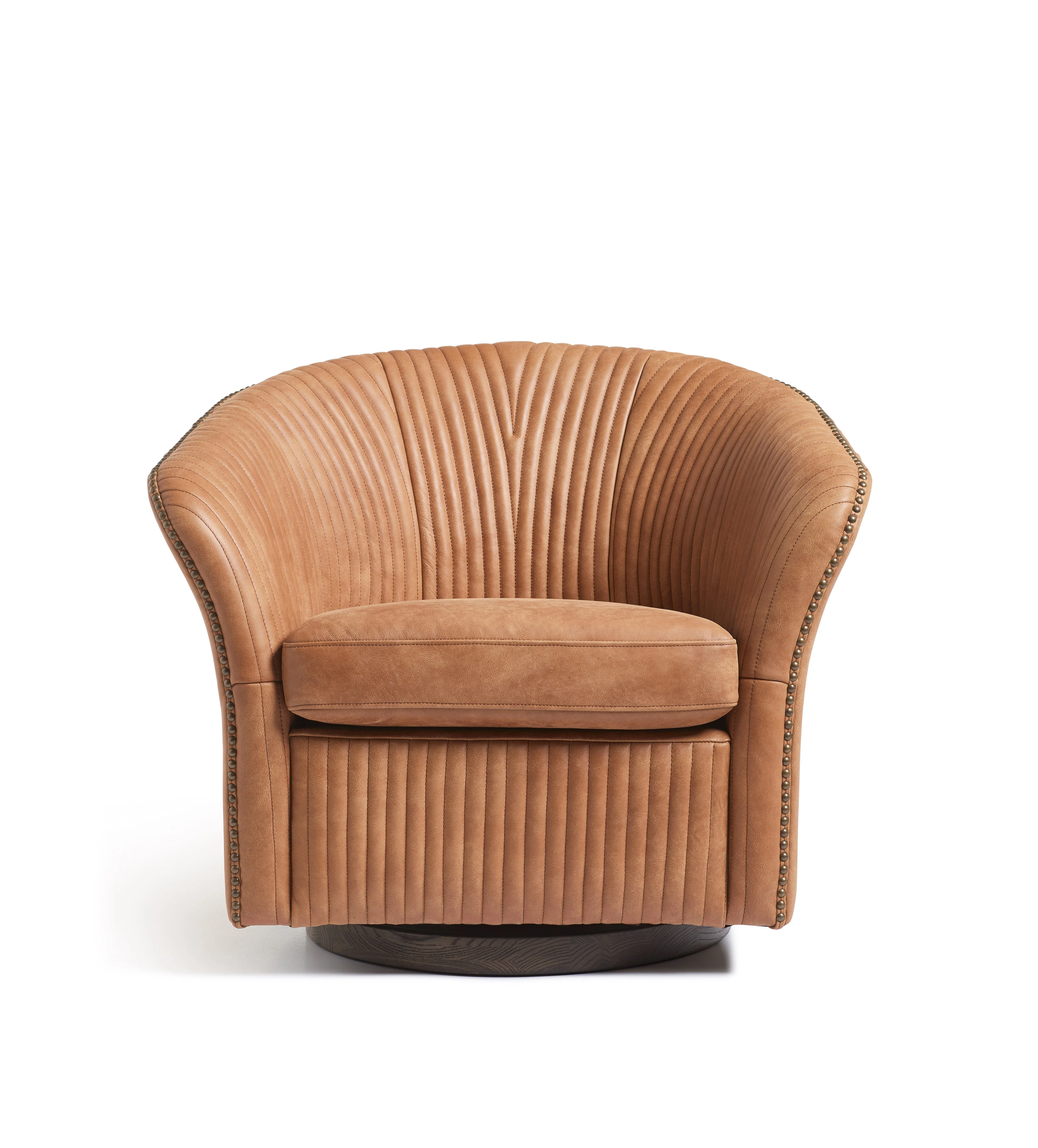 The sophistication of our Crosby Armchair has been redesigned to make the most stylish of swivelling chairs. Brimming with 1940s appeal, it takes its name from the musician of that era, Bing Crosby. The chair is finished in fluted Hazelnut Brown leather and framed by hand with brass-coloured studs for extra charm.