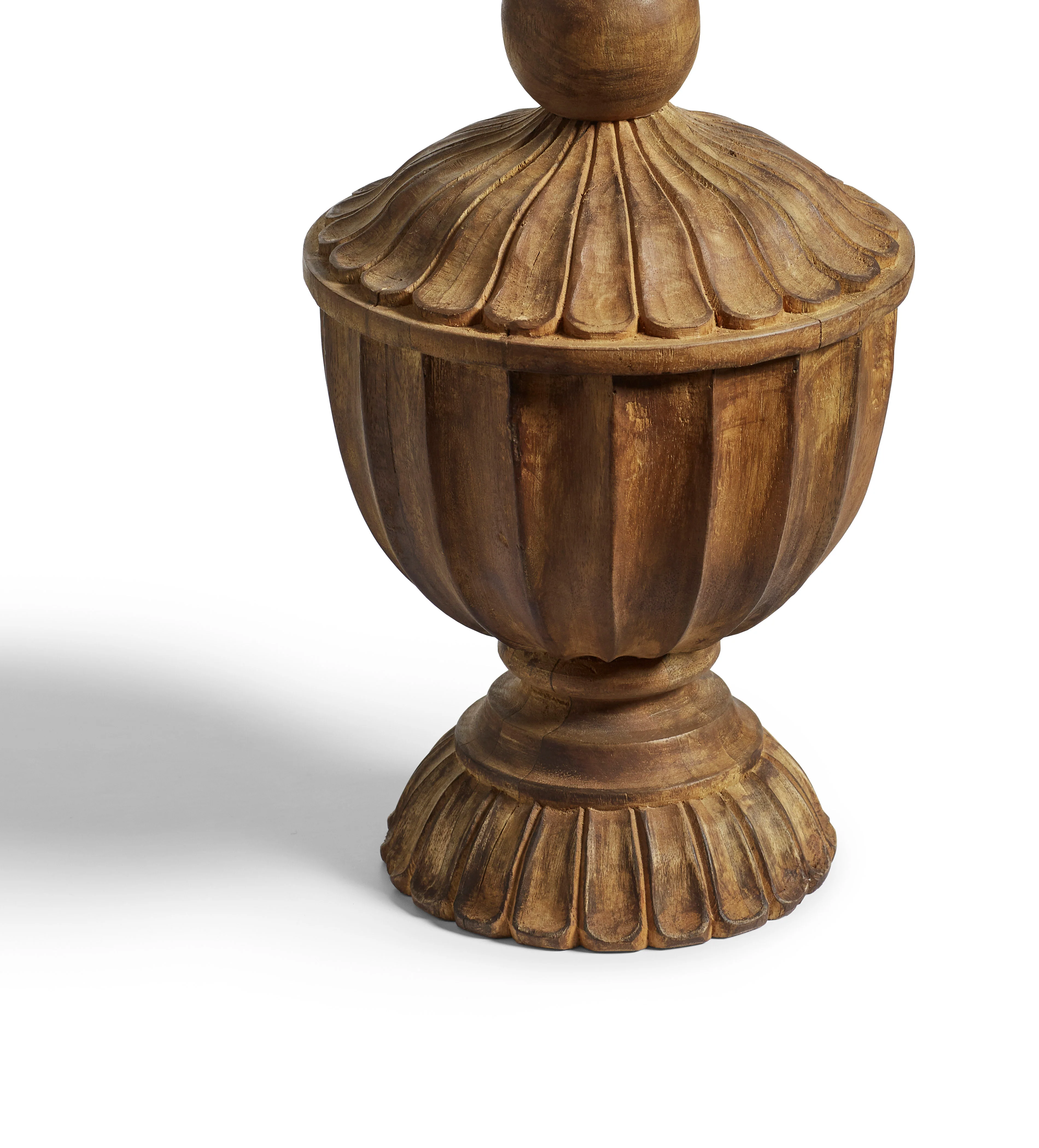 Hand-carved by skilled artisans, the Dalkeith Table Lamp exemplifies honest craftsmanship. The scalloped shape is enhanced by beautiful detailing on the pedestal base and completed with a natural, warm wood finish.