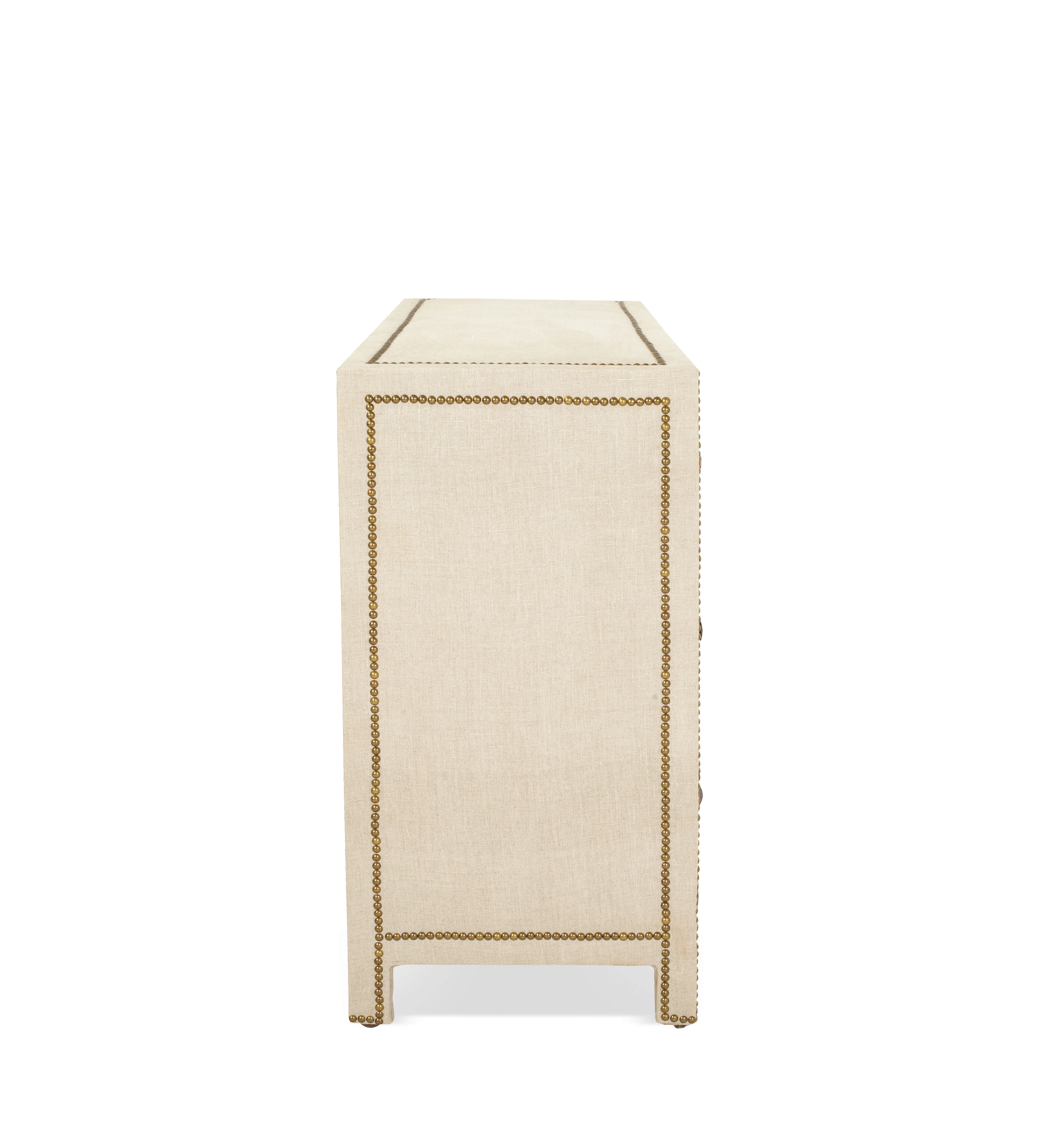 If a wonderfully decorative, show-stopping and highly unique chest of drawers is what you've been looking for, then you've finally found it. Upholstered in 100% natural linen, our Durbar Chest of Drawers consists of three drawers embellished with a floral design made from hundreds of antiqued brass studs.
