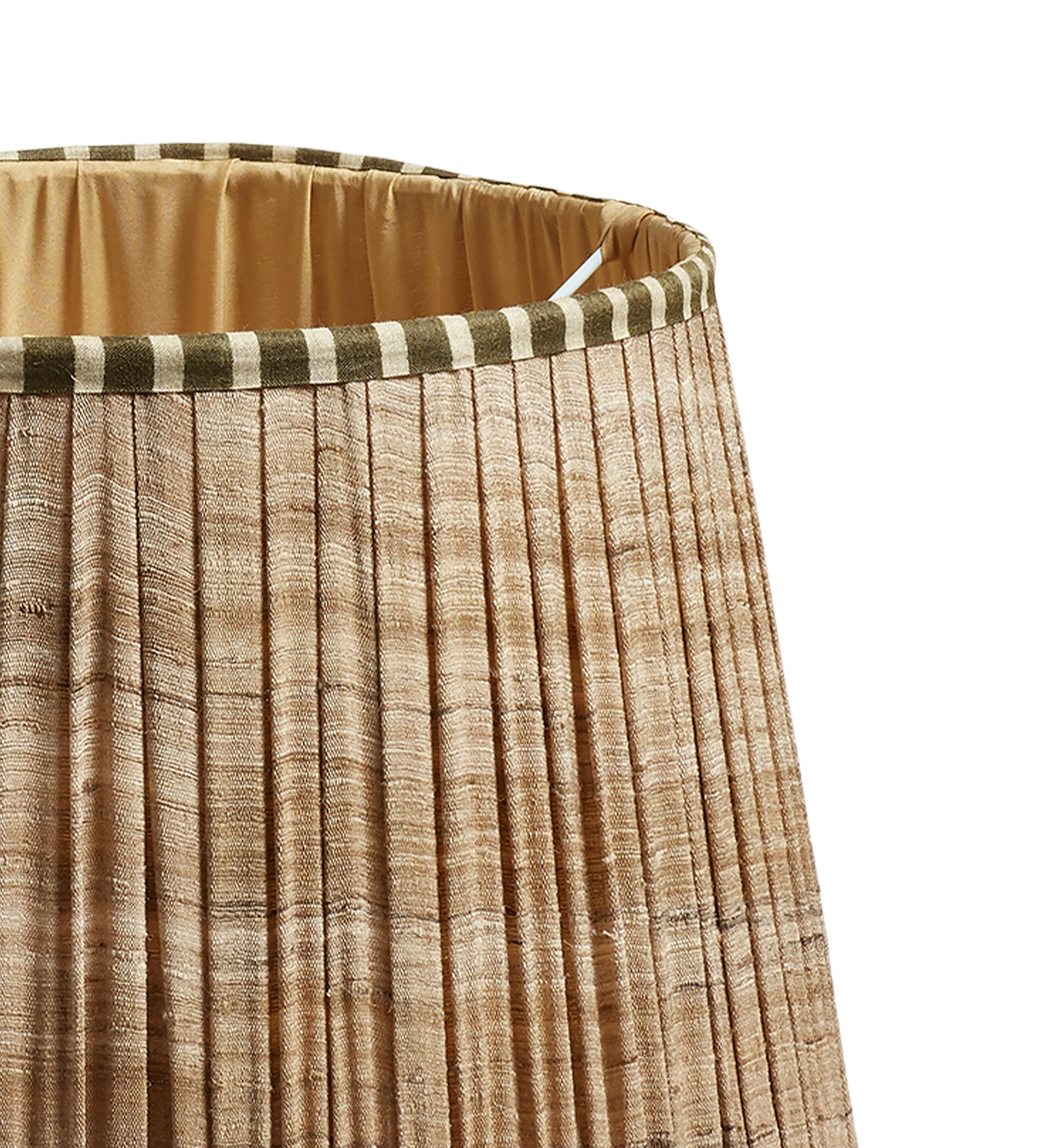 Our Elgin Lampshades are made from natural tussar silk which lends them a natural marbled effect. The silk is then pleated by hand and manually stitched onto its metal frame, before being finished with an olive stripe around its edges. This small shade is perfect for more petite lamp bases.