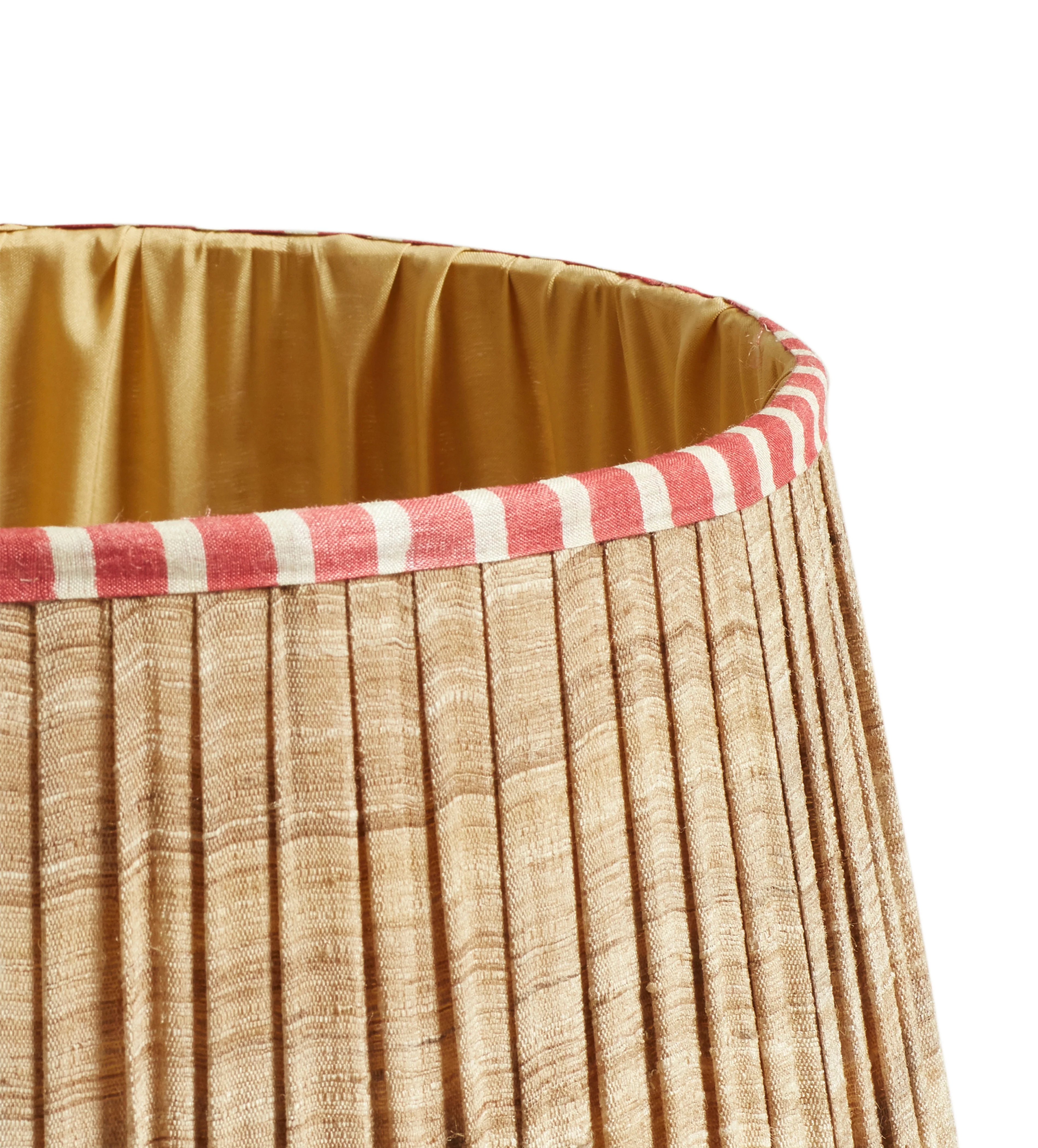 Our Elgin Lampshades are made from natural tussar silk, which is screen printed for a marbled effect. The silk is then pleated by hand and manually stitched onto its metal frame, before being finished with a red stripe around its edges. This smaller shade is perfect for more petite lamp bases.