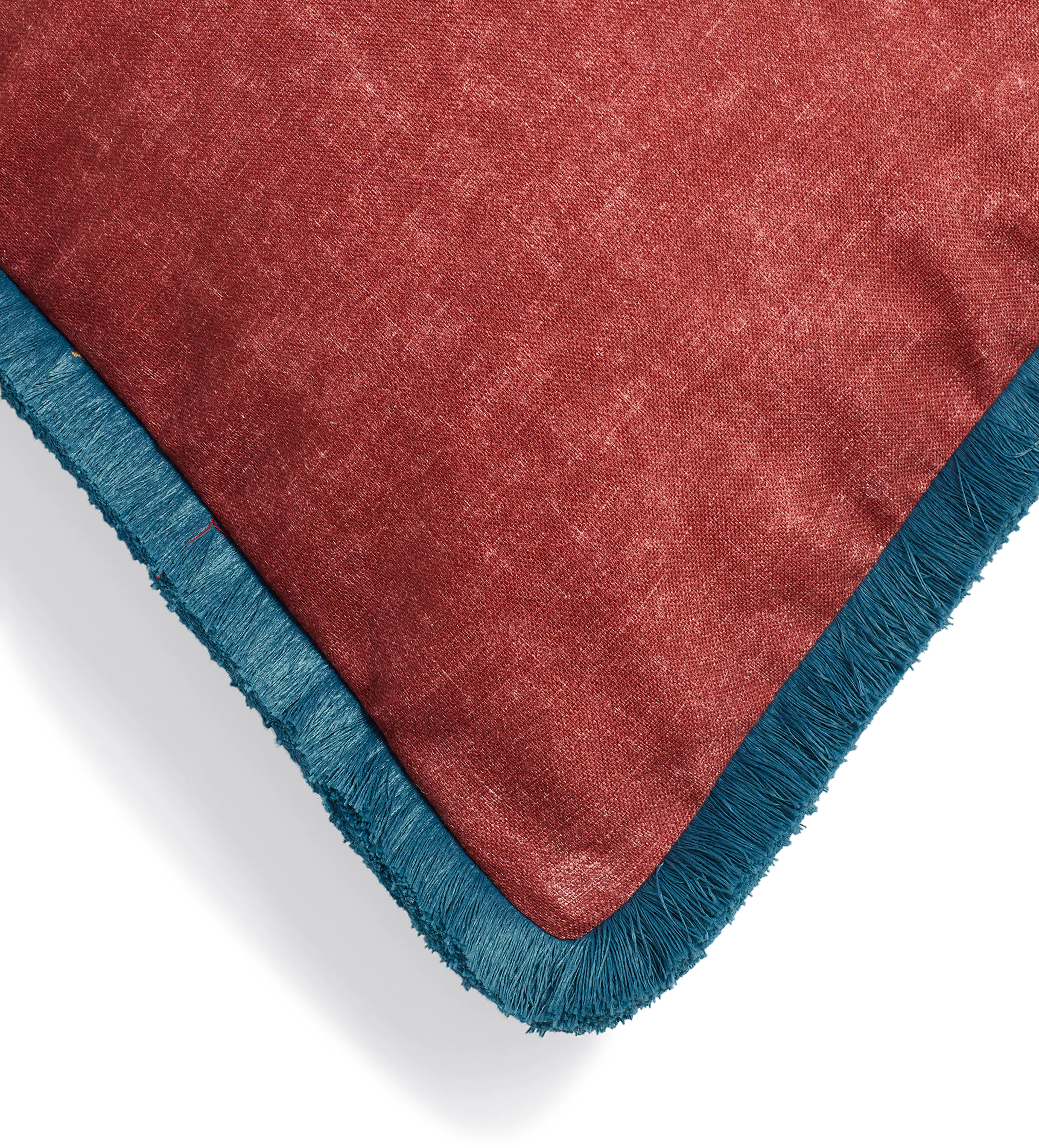 Our Farley Cushion is the perfect option for bringing the comfort of the indoors to your outdoor spaces. Its linen-like appearance in a deep red shade has the added benefit of being shower resistant and anti mildew, while retaining softness. An air-force blue fringe frames the cushion for inviting style.