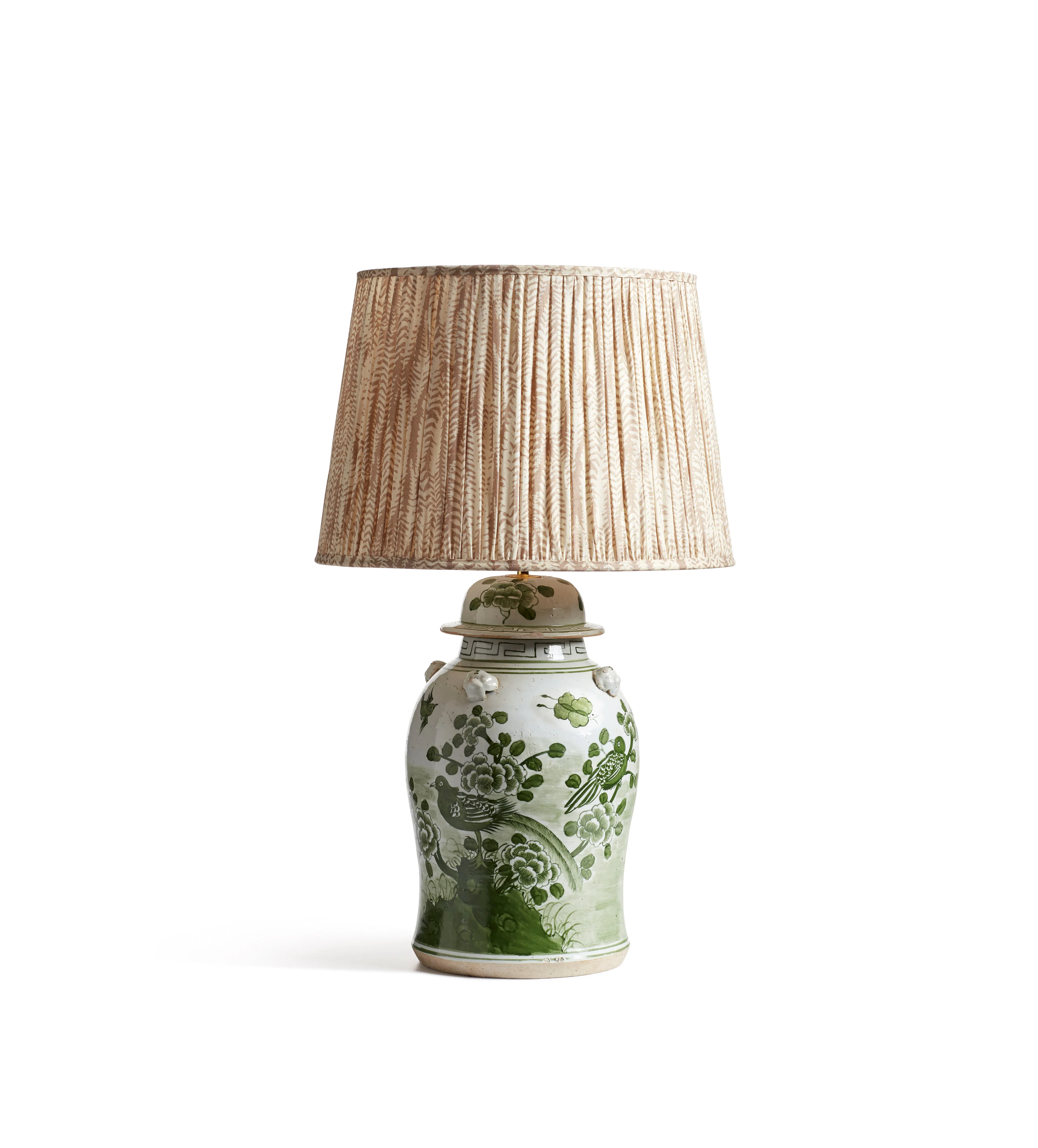 This beautiful ceramic lamp is inspired by the traditional ginger jar. It is hand-decorated with gargoyles and birds in a classic Chinese landscape scene. The hand-painted jade green birds have a mythical quality about them, which is why we named it after the immortal birds in Chinese mythology that reigned over all others. A purposefully distressed finish makes the Fenghuang look antique.