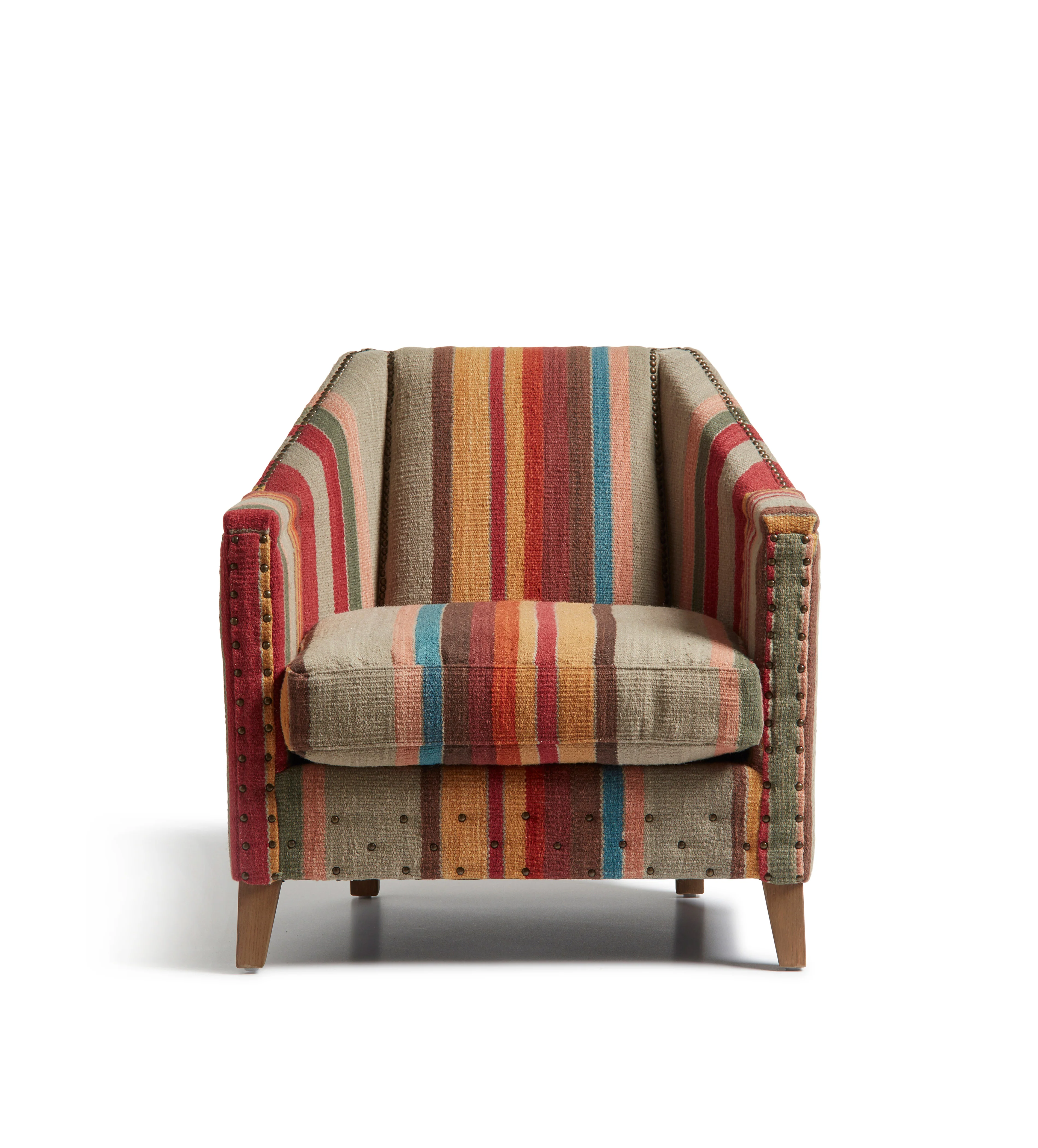Club chairs were originally created in France, named 'fauteuil confortable' - which translates to 'comfortable armchair'. This could not be more fitting for our Large George, which has been reimagined with bigger dimensions and finished with striking, handwoven upholstery that adds an instant pop of colour to a room. The upholstery is crafted by skilled artisans, who take their time expertly weaving strands of wool and cotton into a Kilim rug by hand: this process involves natural threads being placed on a loom to form the rug's base, then coloured strands are woven horizontally to form the stripe. The rug is then washed and brushed for an antiqued appearance and carefully clipped of stray threads, before it is applied to the frame of the George and finished with brass studs. Due to the artisanal techniques used, each piece will have individual characteristics that add to their charm.
