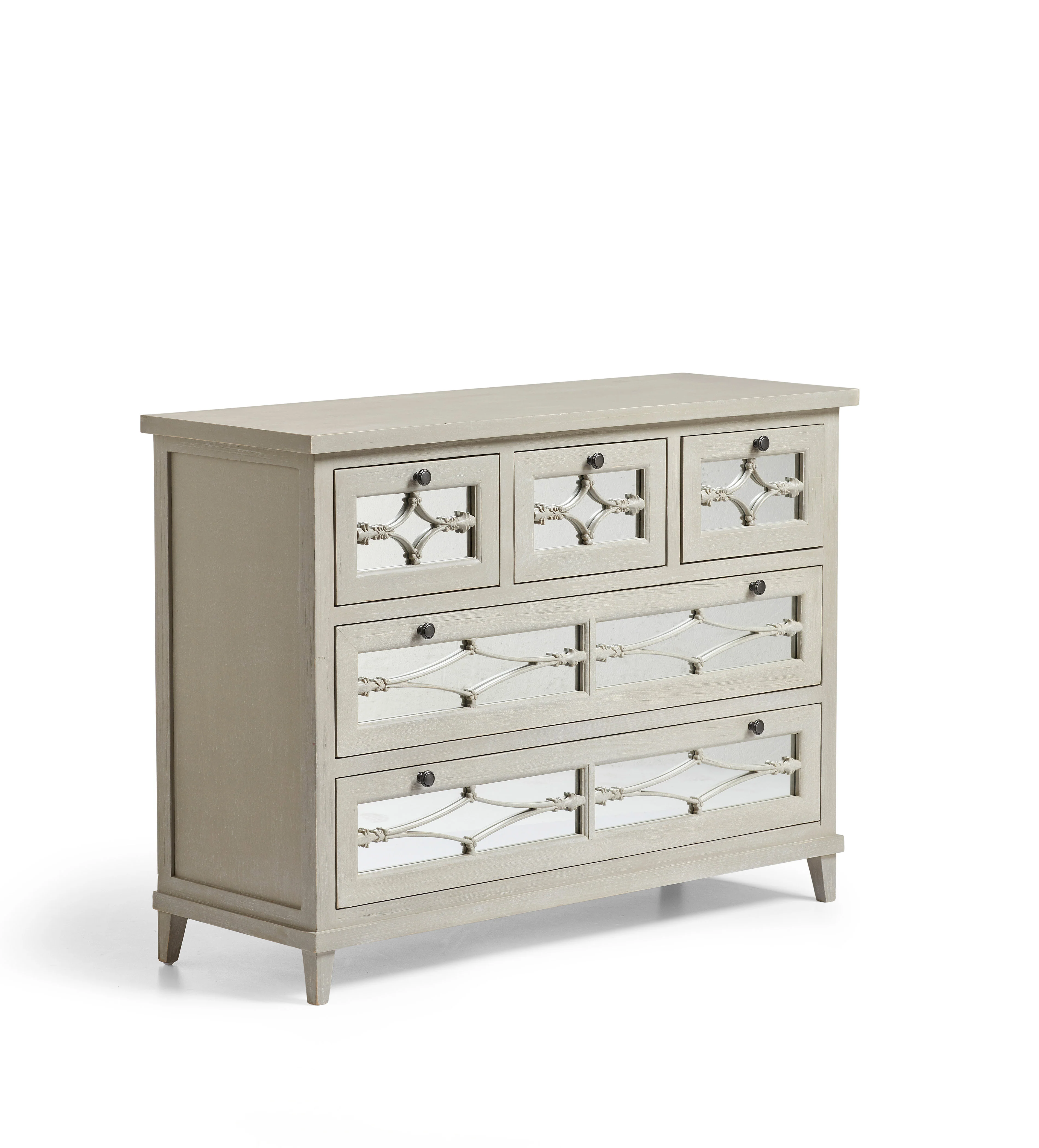 Enriched with Classical and Renaissance detailing – balanced proportions, architectural accents and refined carvings – the mirror-panelled Herald Chest of Drawers is made from recycled pine. Hand-finished in warm grey, the mirror panels are topped with diamonds tipped with fleur-de-lis motifs