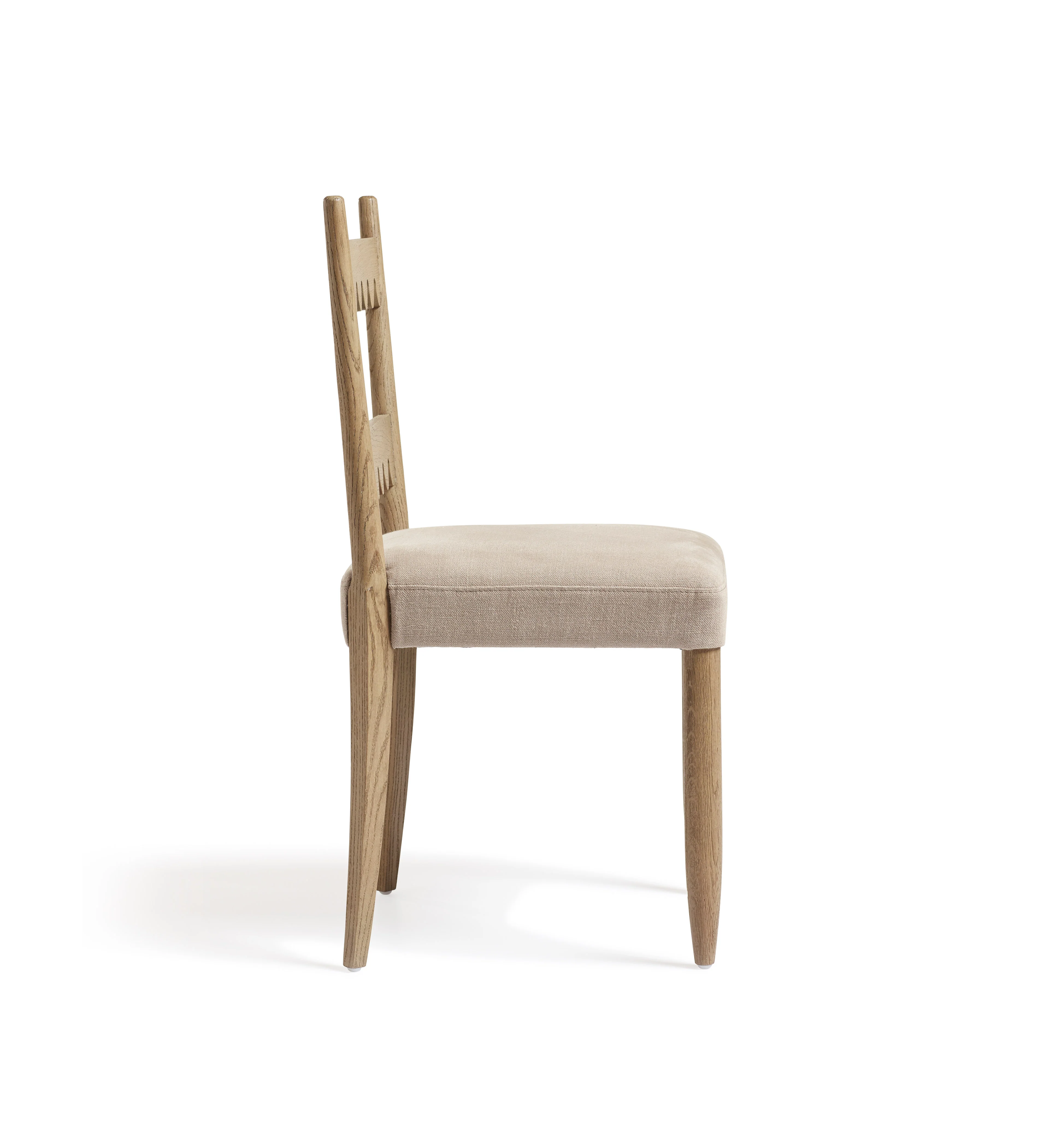 Jennie is delightfully named not only for its scalloped back detail (in Welsh origins the name means white wave), but also for the celebrated woodworker Jennie Alexander. Crafted from solid oak, the chair features pinpoint front legs and curving tapered back legs. A dacron-wrapped webbed foam seat is upholstered in taupe linen for great comfort.