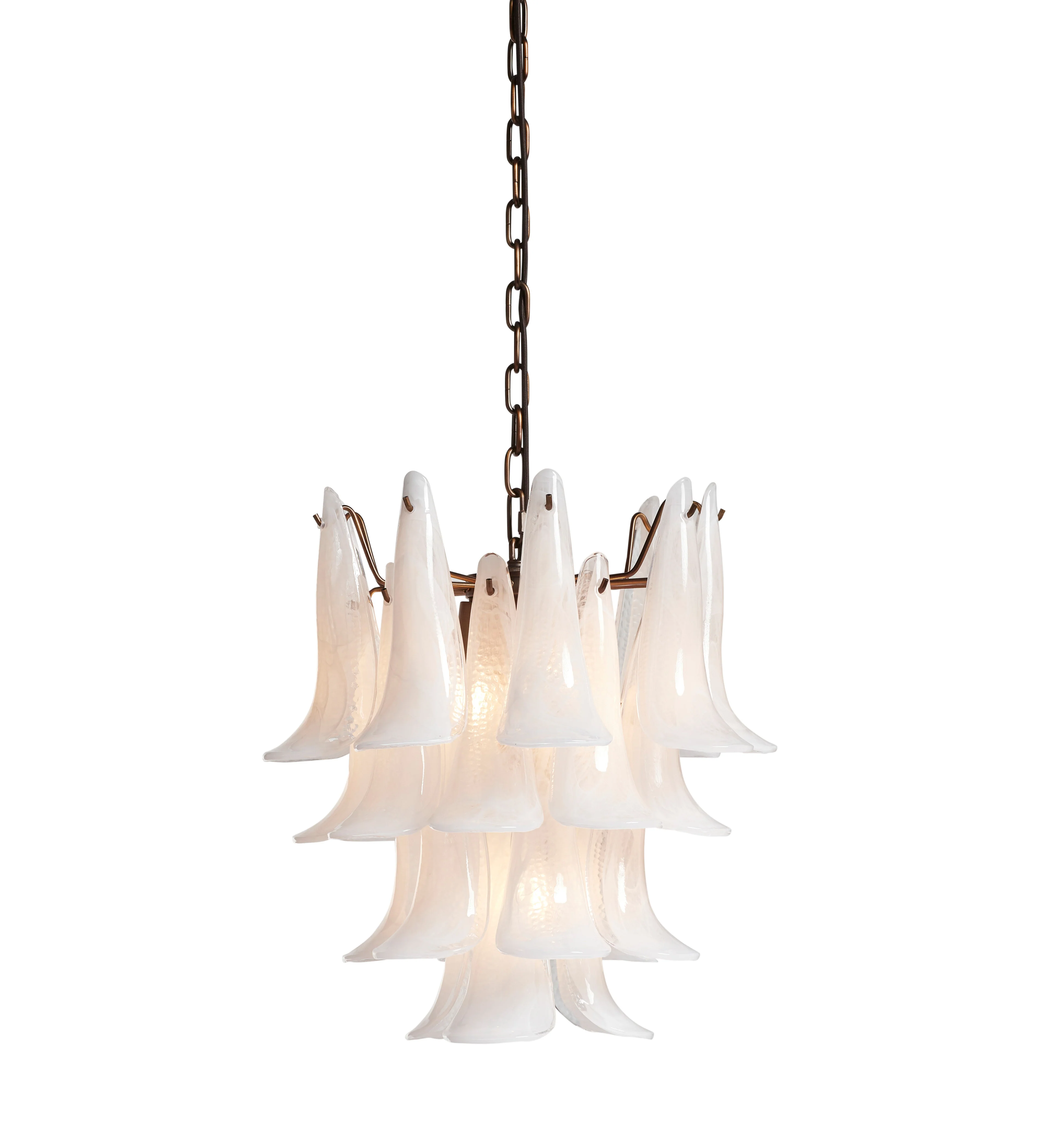 Delicate proportions mean the Kaihua Tiered Glass Chandelier dials up the drama in even the tightest of spaces. Meaning ‘to blossom’ in Mandarin, the luxurious ceiling light is beautifully-crafted from 27 individual petals that are carefully attached to its elegant metal frame, the swirled white-coloured hammered-glass contrasting with the antique brass. The chain, which matches the opulent finish of the frame, can be adjusted to suit the height of your ceiling.