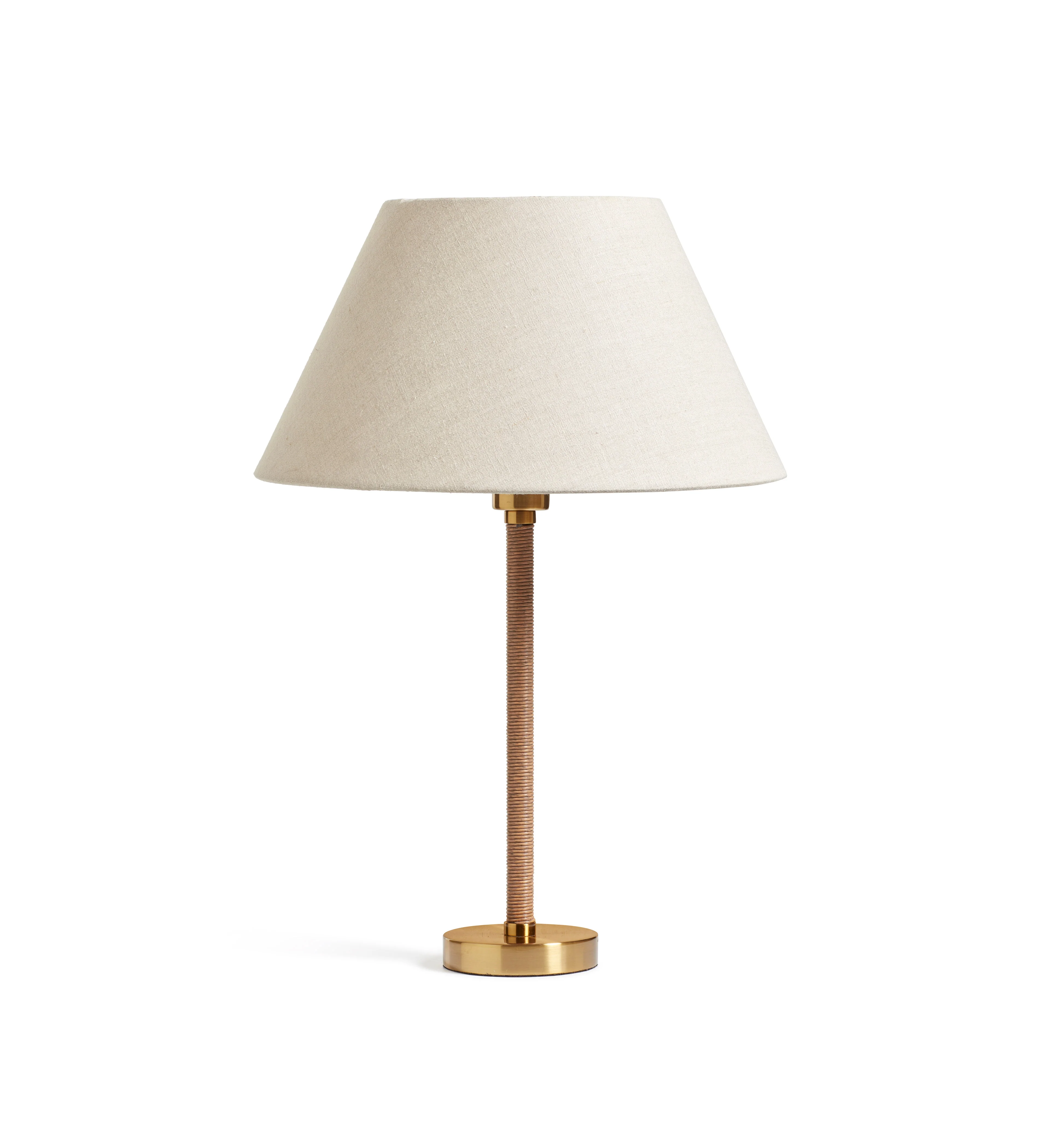 The Kirana Table Lamp has a sophisticated appearance due to the faux rattan that wraps around its iron hardware, with the exposed metal electro-plated with a brass finish.
