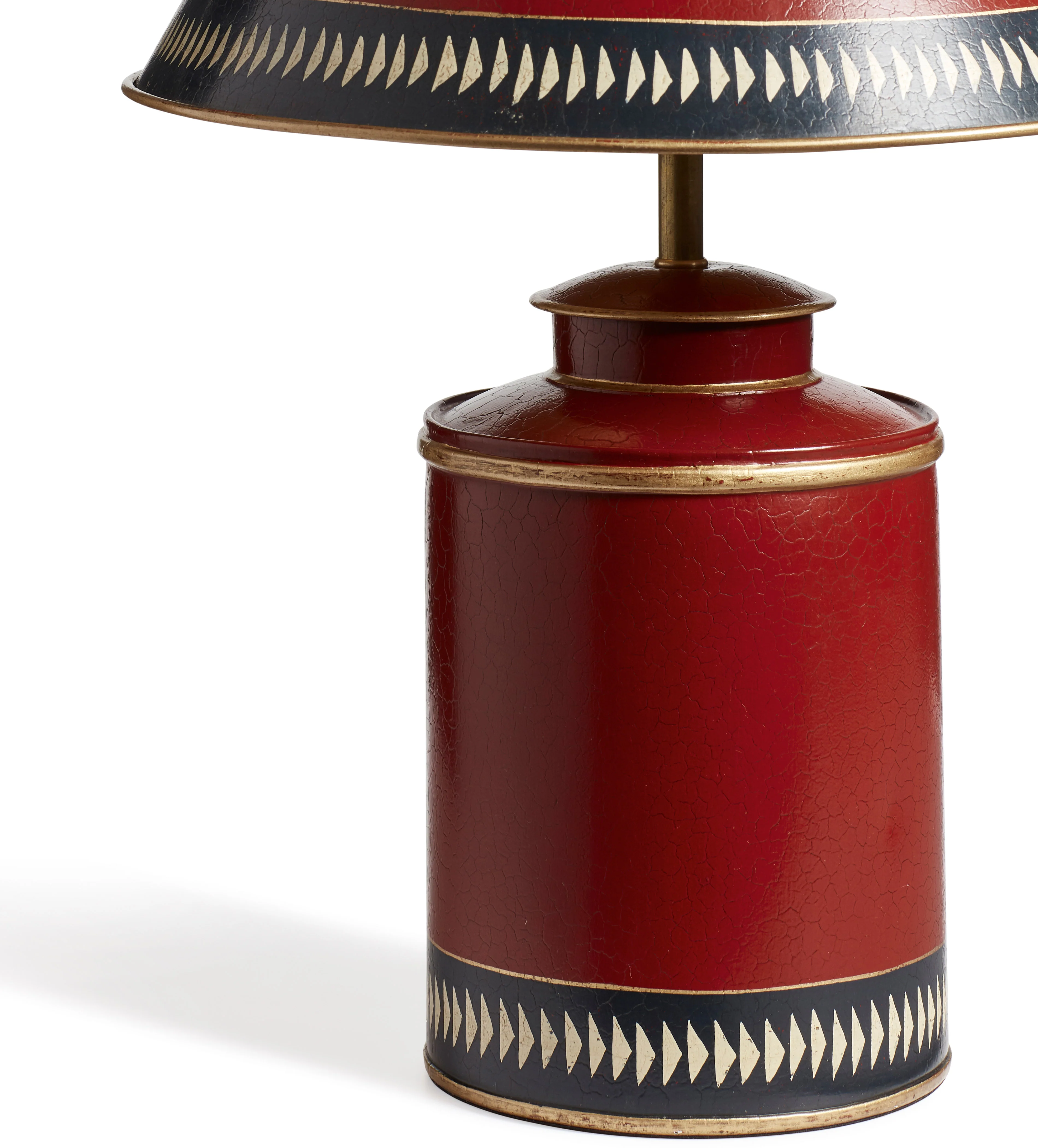 The Kolmio Table Lamp is a striking piece, handmade from iron and meticulously hand-painted in red with a repeating arrow-pattern border and bronzed edges.The shade is hand formed and hand welded, combining vintage style with Regency-era gold touches and bold, rich colours.The details are hand painted by a small group of talented artisans led by a master painter who has honed their craft over many generations to produce these beautifully layered pieces. The colour is created in a lengthy process through many layers of paint; the craftspeople wait for each layer to dry before applying the next, and finally adding a crackled effect for antique style. Due to the artisanal techniques used, each piece will have individual characteristics that add to their charm. This lamp would look beautiful tucked away in a reading corner, adding interest and colour into the darkest corners of your home or equally, front and centre as a focus of your desk or dressing table for all to see.