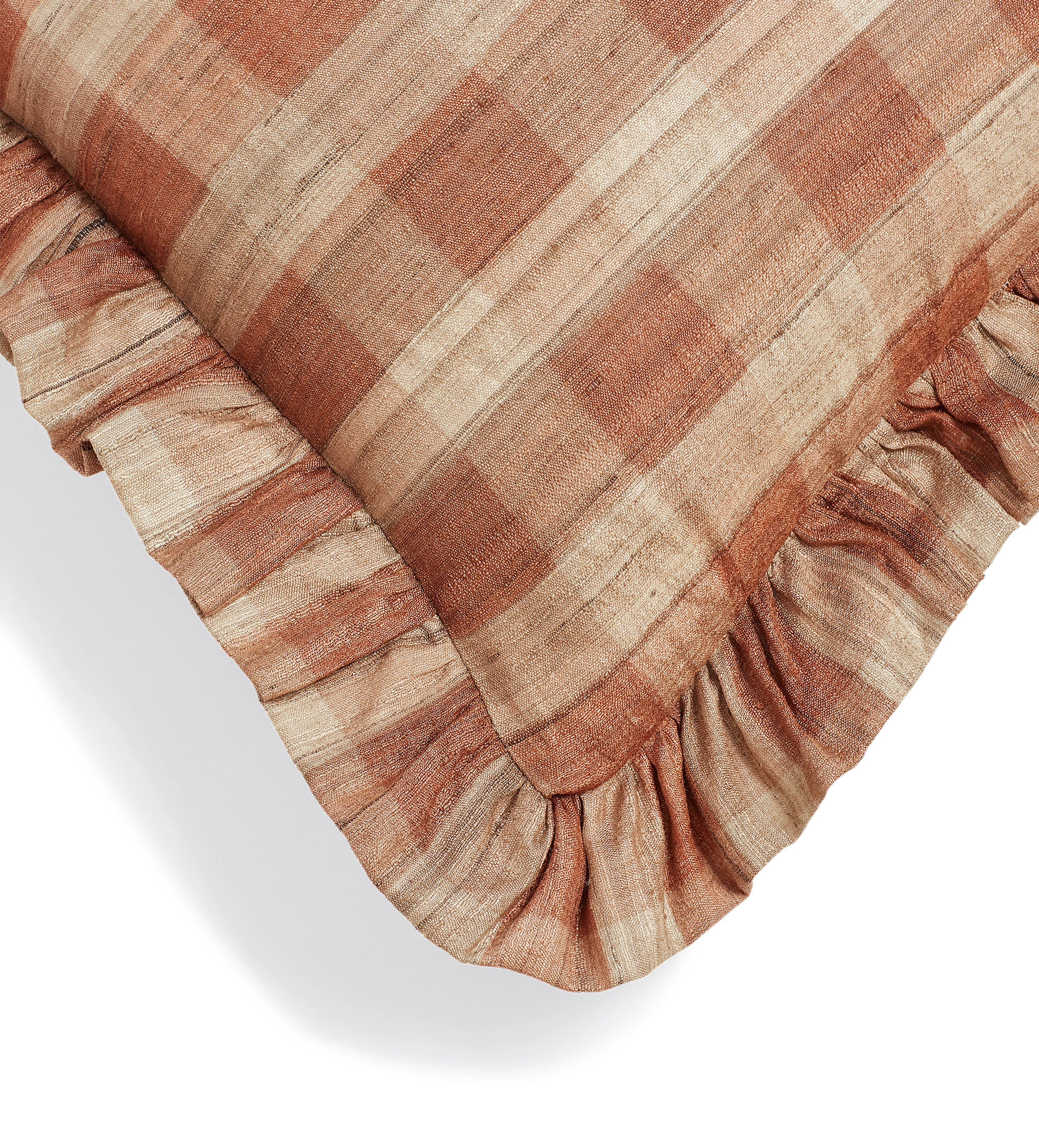 The chunky check design of our Lavanya Cushion Cover is crafted from tussar silk that's hand-screen printed in a warm Apricot hue. The natural material is cultivated in the Indian states that have been producing the yarn for centuries. Each stripe is screen printed by hand both across and down the cloth, creating layered depth. Due to the nature of the fabric and the artisanal processes that shape these cushion covers, there may be some variation in colour and texture between each piece - that, plus a ruffled border all adds to their charm.