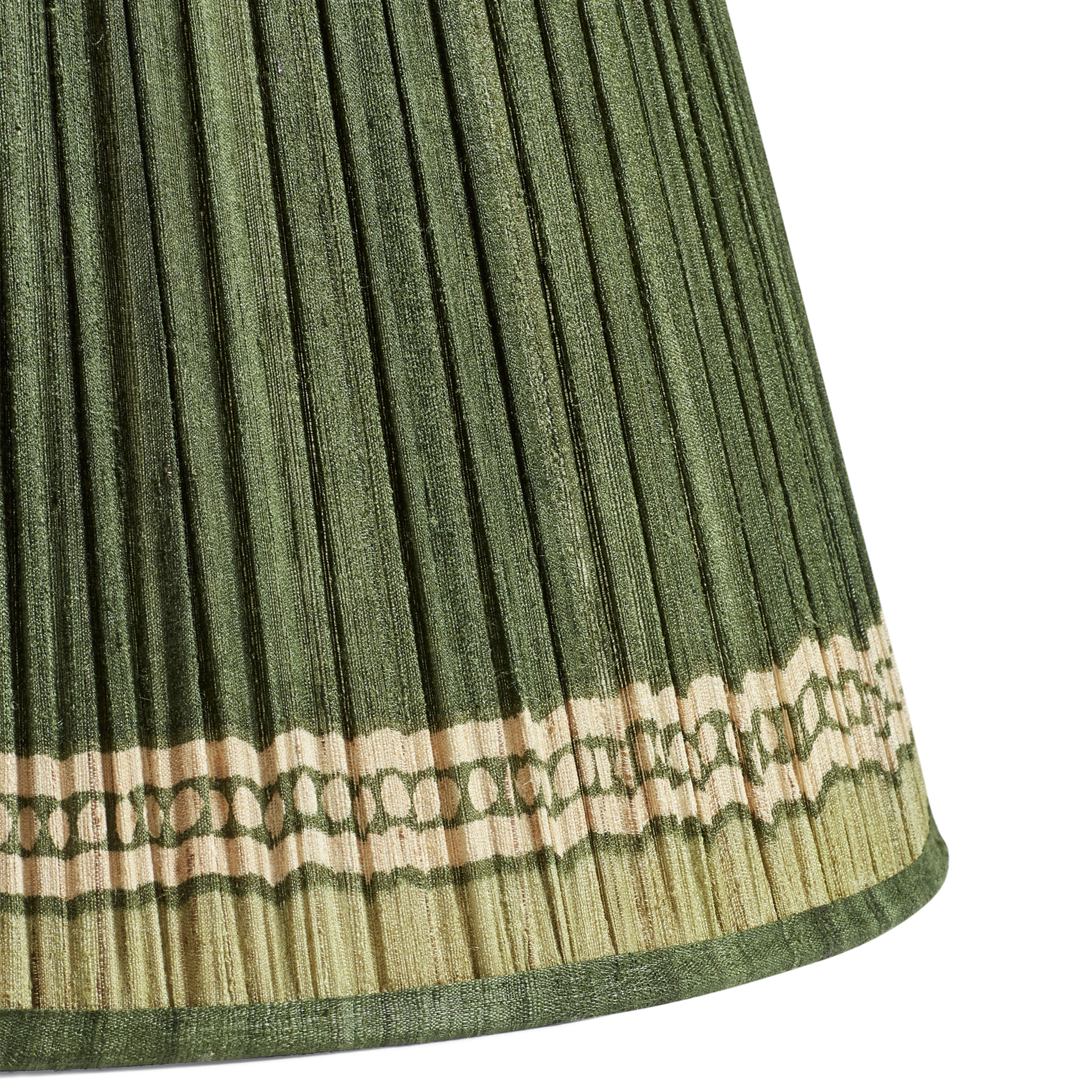 Our Longshan pattern has long been a favourite within our cushion collection, with its silk base and subtle block-printed border. We've now adorned our lampshades with the popular print, reimagining the cushion's border so that it runs along the bottom of the shade like a pretty chain. With a muted Grey Green tone that's achieved through a hand-dyeing process, it will bring a gentle glow to any corner of your home. This is the smaller of two sizes.