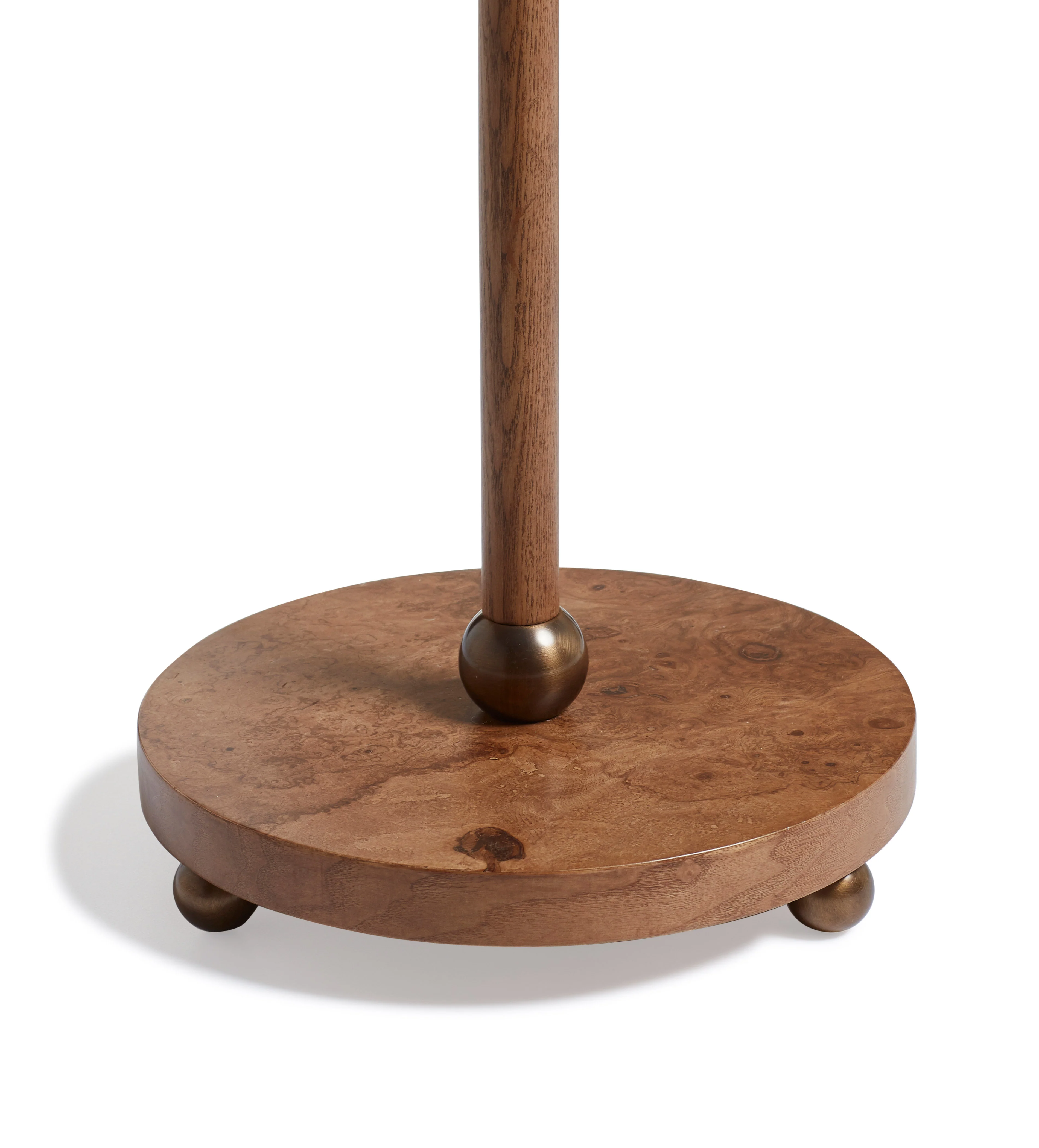 Inspired by an antique found by our Design Director, the playful form of the Lucas Floor Lamp is also incredibly elegant. Narrow hand-pleated off-white linen lampshades sit on a trio of precisely formed antique-brass curving arms that extend upwards to hold the bulbs. These are arranged at staggered heights to encourage the light to climb around the room. The burl wood base sits upon three brass ball feet which complement the piece. Burl wood has a beautiful and unusual grain - this is a cross section of the knots that form on trees, and so features a swirling pattern referred to as a 'wild grain', that requires highly skilled craftsmen in order to cut it without splitting the wood.