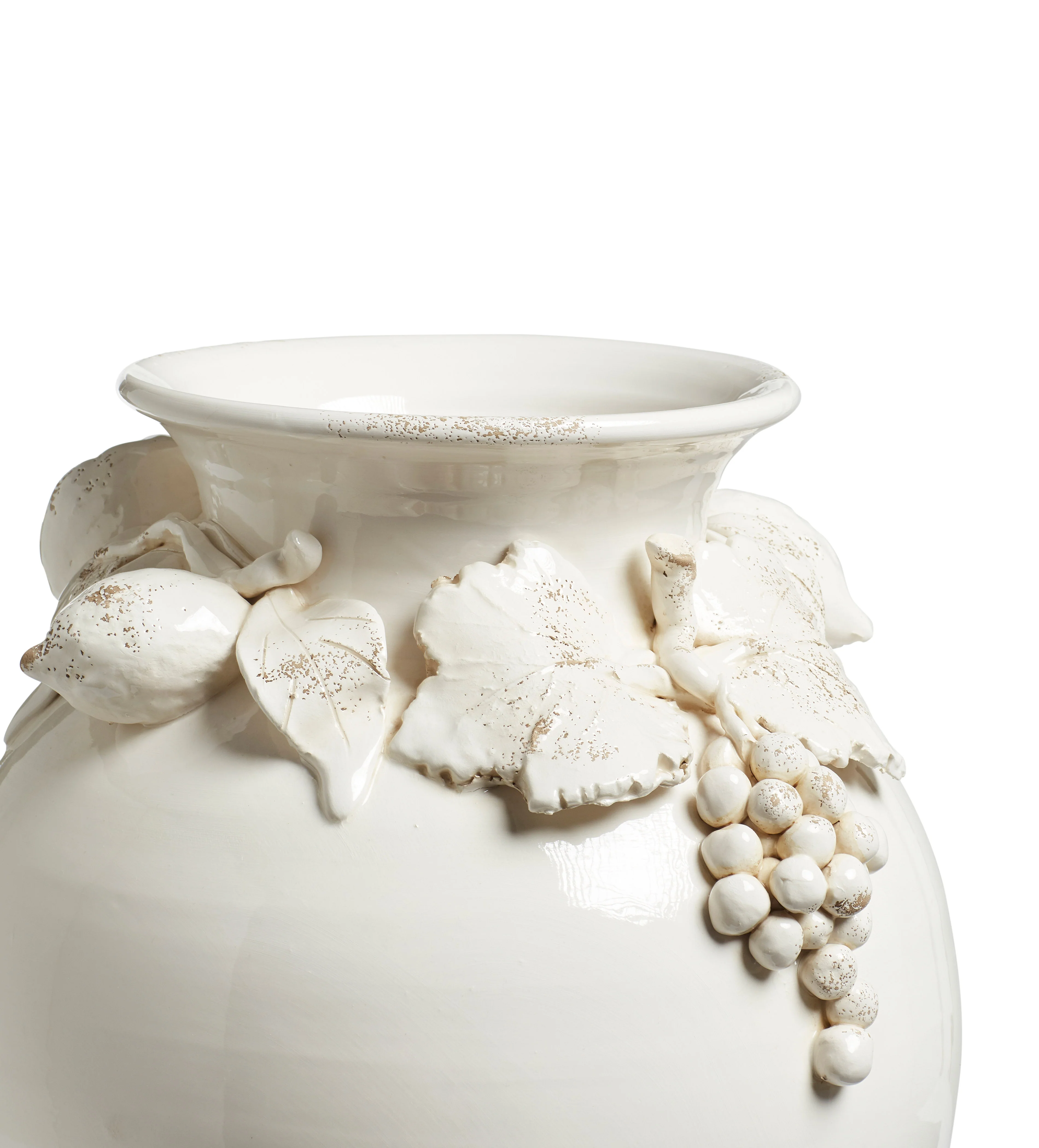 Handmade in Italy by skilled artisans, the Opora Vase is crafted from robust Tuscan stoneware and adorned with hand-applied fruit motifs, from lovingly detailed grapes and apples to delicate pears and leaves. Its rustic, distressed finish lets glimpses of the clay beneath the glaze shine through, celebrating the handmade process. It is produced in a village outside Florence with over 50 years of ceramic expertise. Due to the artisanal crafting process, each piece will have individual characteristics that add to their charm.