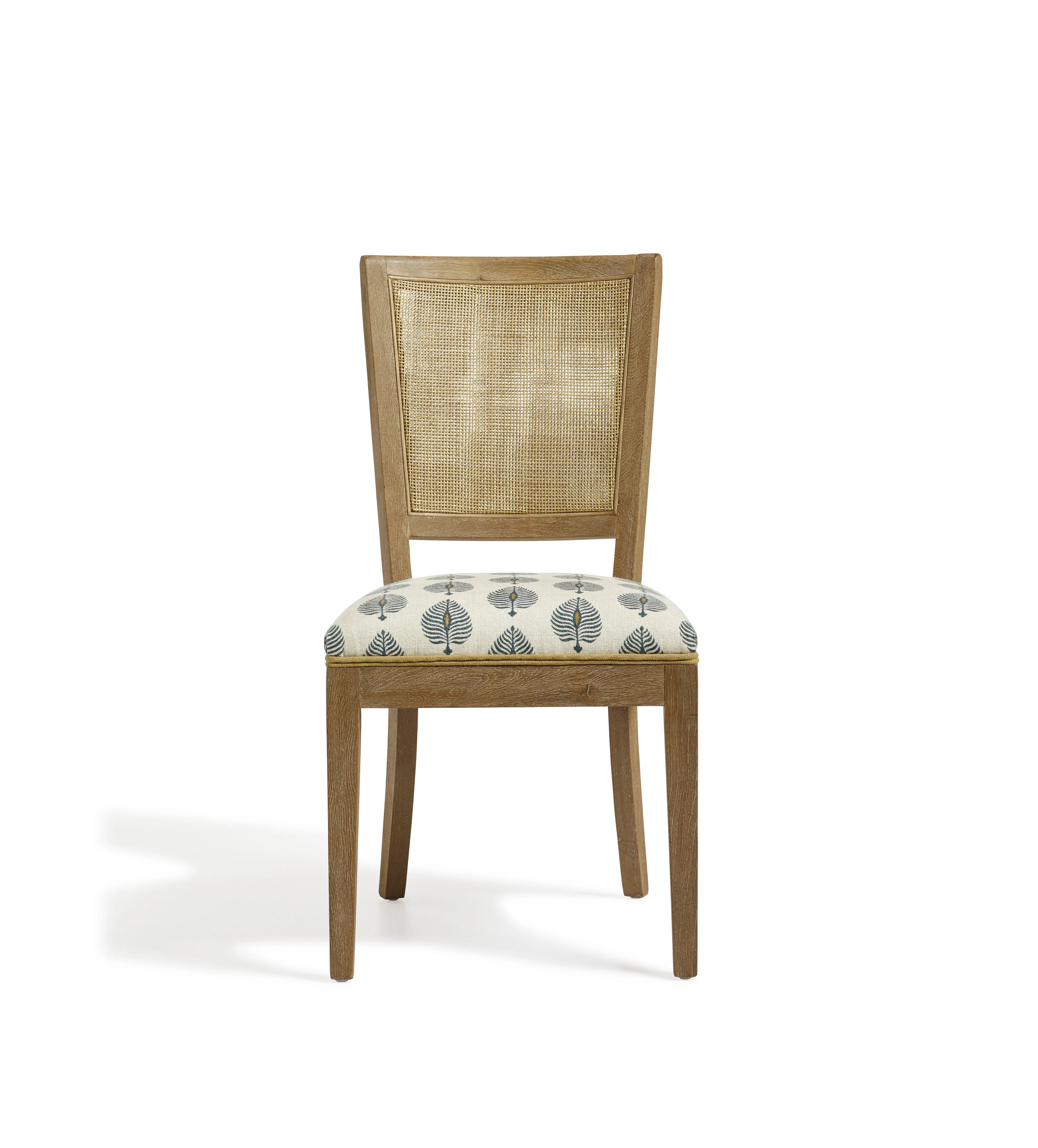 This stunning caned dining chair is named after a town near the birthplace of Georges Jacobs, the master French designer who crafted caned furniture for Marie Antoinette. The tapered legs are topped with a comfortable foam-filled seat upholstered in linen featuring our popular Ocellus print. Due to the natural materials used, each piece will have individual characteristics.
