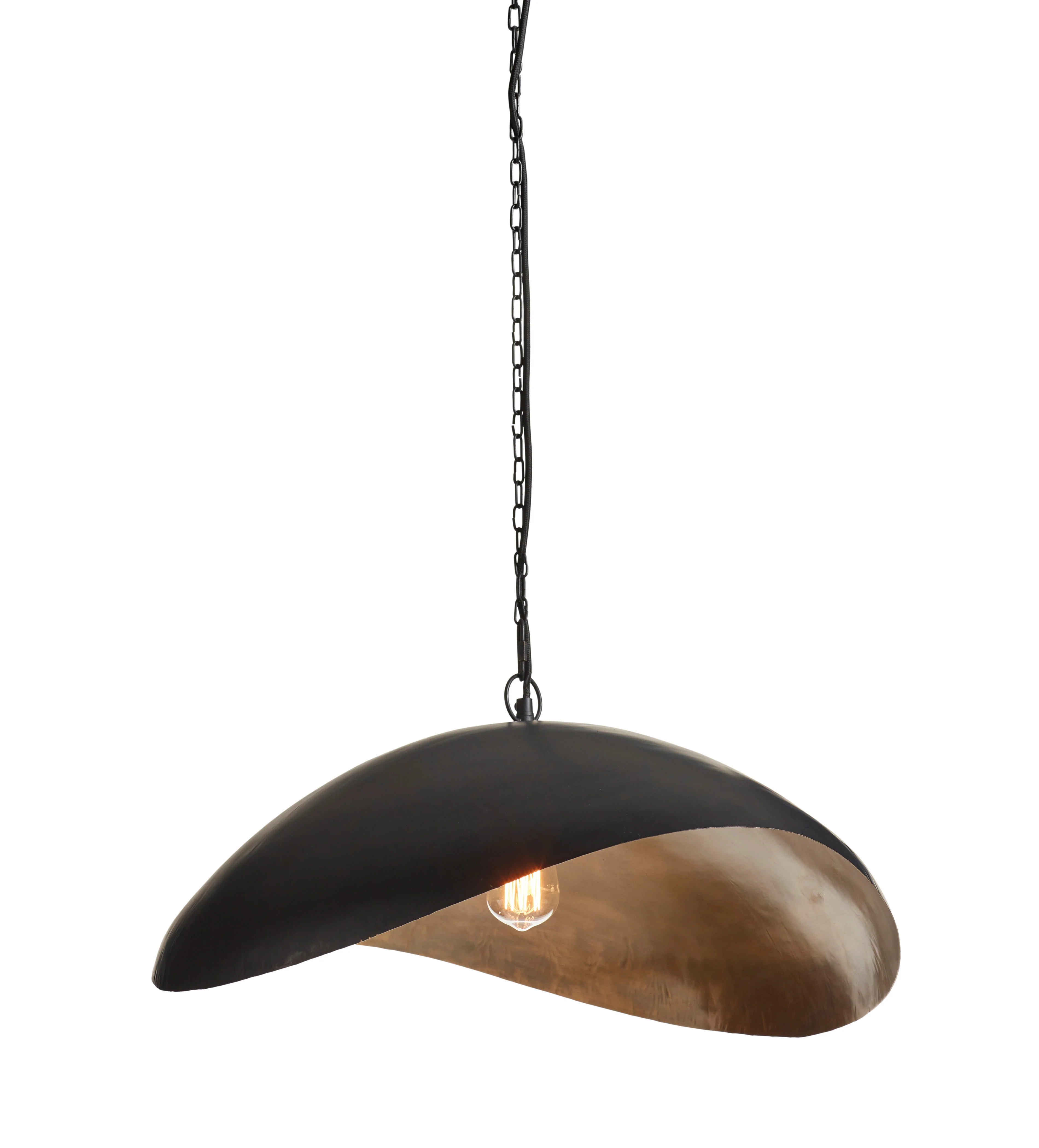 The glossy antique brass interior of our Ostra Pendant Lamp is beautifully contrasted by its matte black exterior. Artisans hammer the iron into shape to achieve its undulating curves. Due to the manual process, each piece has individual characteristics and authentic markings that make it unique.