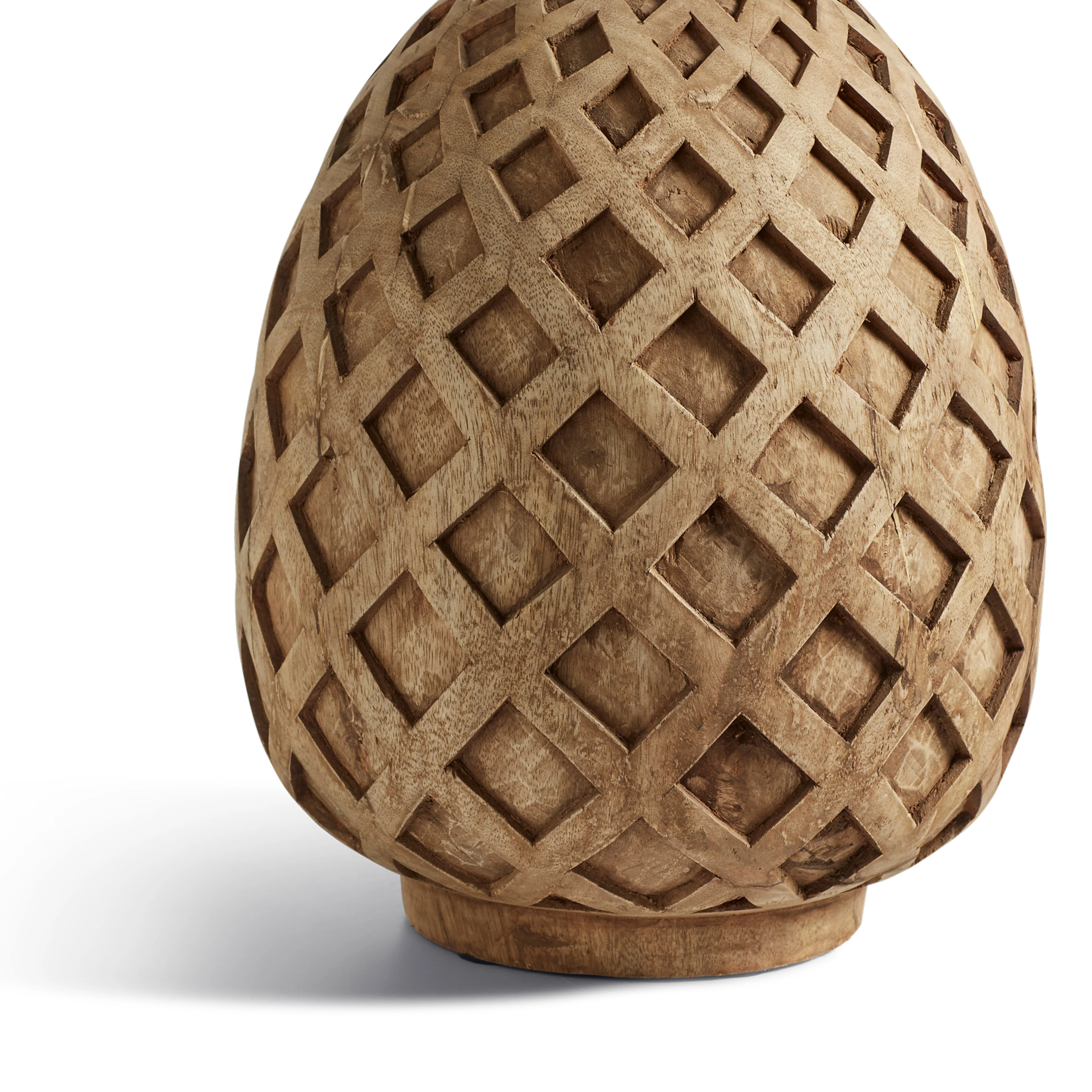 Our Pinya Table Lamp is a beautiful example of the wood carving craft. Made from mango wood, each diamond shape is carved into the base in expanding size as the oval form widens. It is a wonderful way to create a statement with your lighting, whether you top it with a plain or patterned shade. Due to the artisanal techniques used, each piece will have individual characteristics that add to their charm.