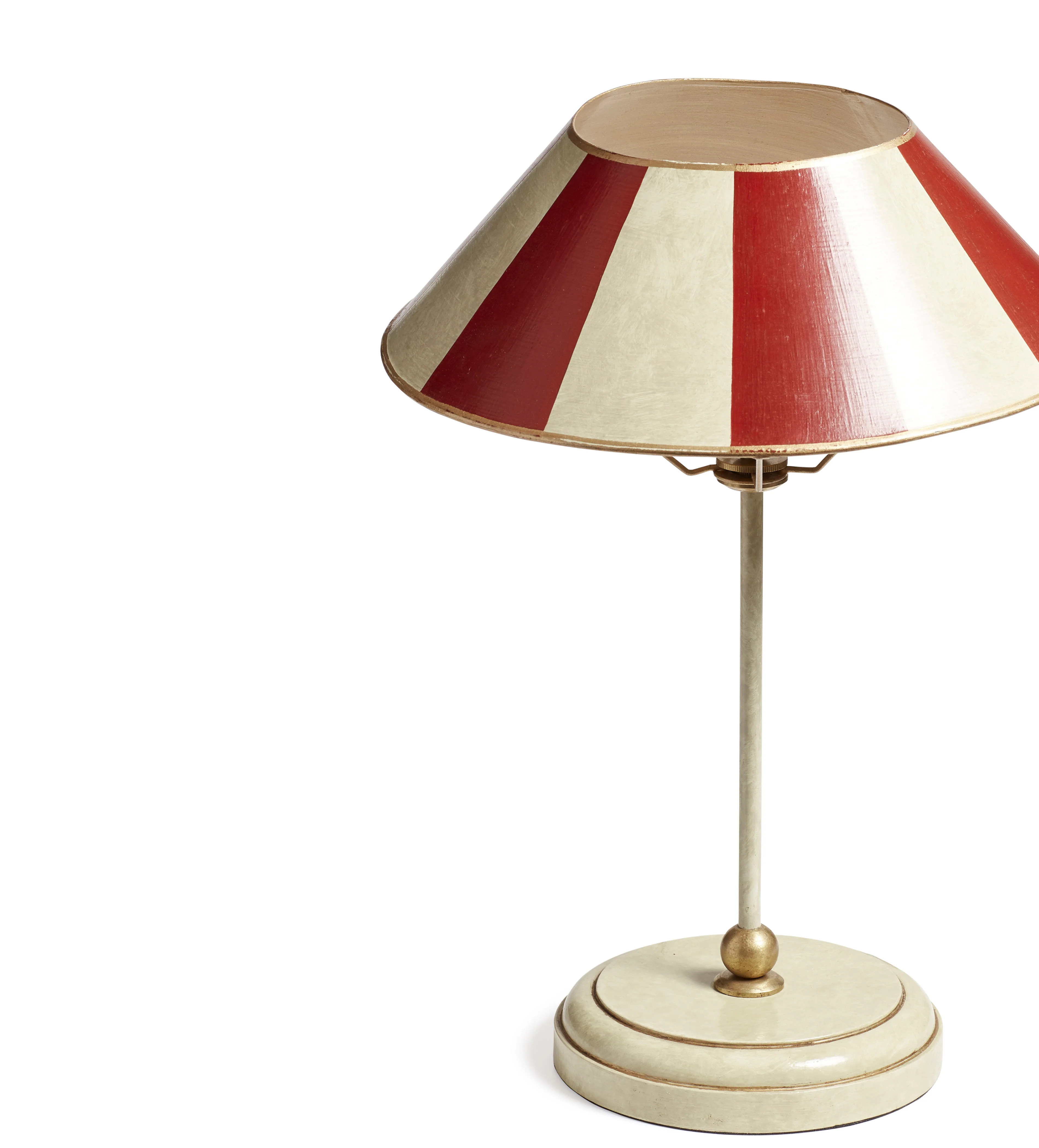 The Purdy Table Lamp is a take on vintage-style lighting. Purdy takes a round approach with its metal shade that is entirely hand formed and welded, hand-painted red-and-vellum stripes reminiscent of big top circus tents. The style is complemented by brushed antique brass-toned edges and hardware. The nature of the layered painting and drying technique means that the craftspeople can only make these lamps at a certain time of year, and so limited numbers will be released into our catalogue at a time, making each piece extra special. Due to the artisanal process and natural elements that have an effect on the making of this piece, each one will have individual characteristics that add to their charm.