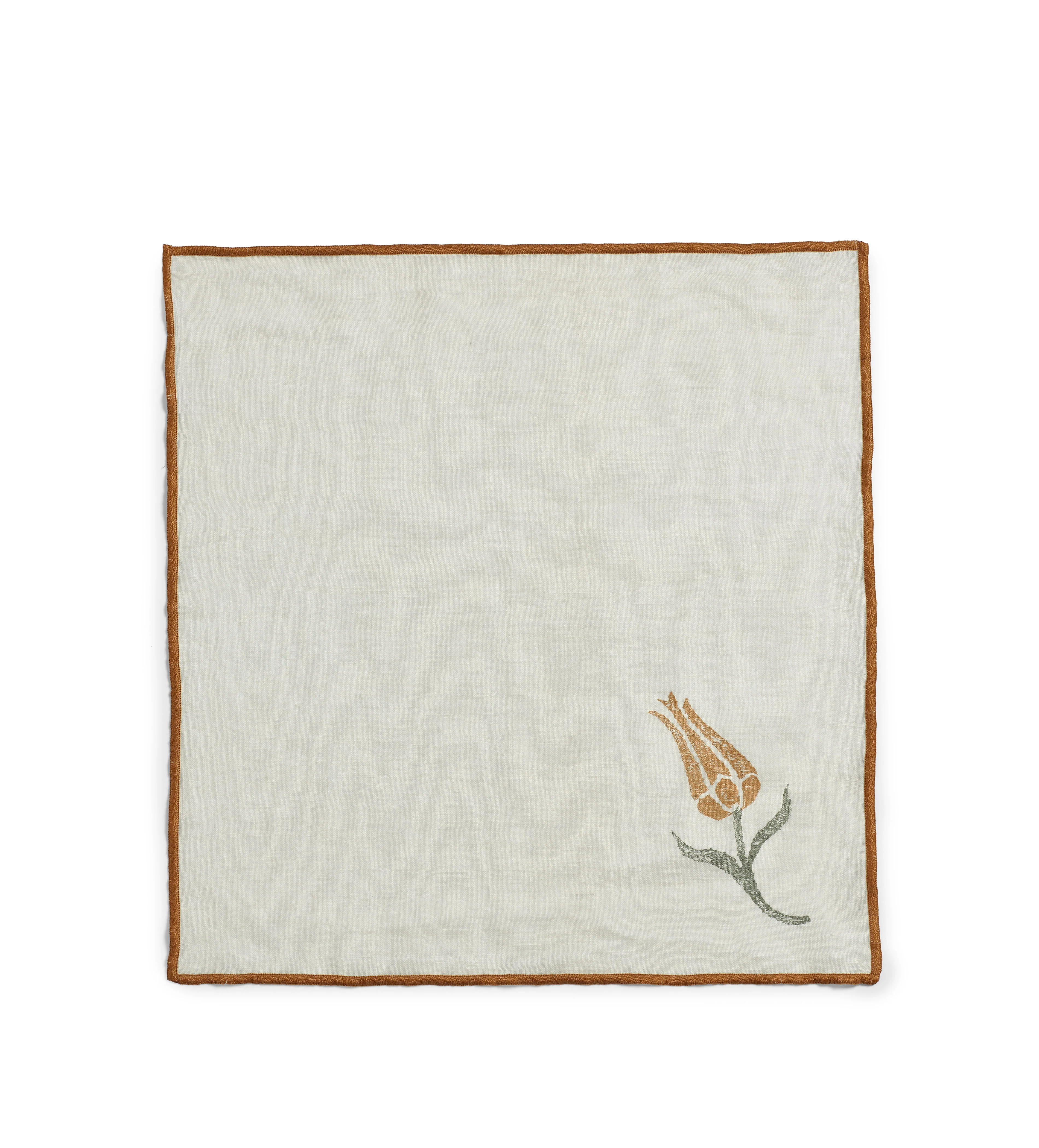 Brighten your table with the Tulipe Set of Four Napkins in a beautiful ochre colourway. Reminiscent of tulip palaces in Turkey, the Ottoman tulip motifs are screen-printed on an off-white base are finished with a delicate hem edge for a timeless look.
