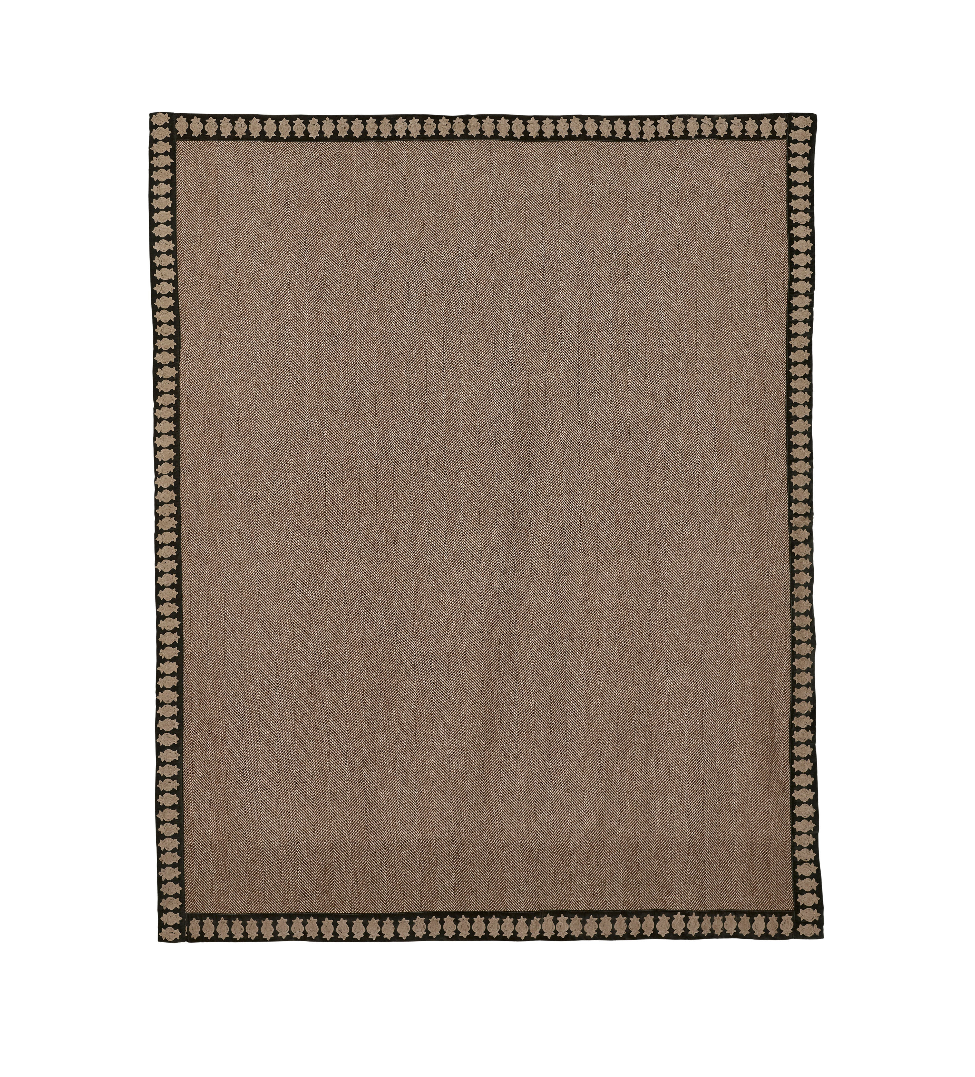 Our Zelva Throw is woven from recycled wool in a deep brown and white herringbone pattern. The throw is framed with a velvet spruce trim that is finished with chain-stitch embroidery.